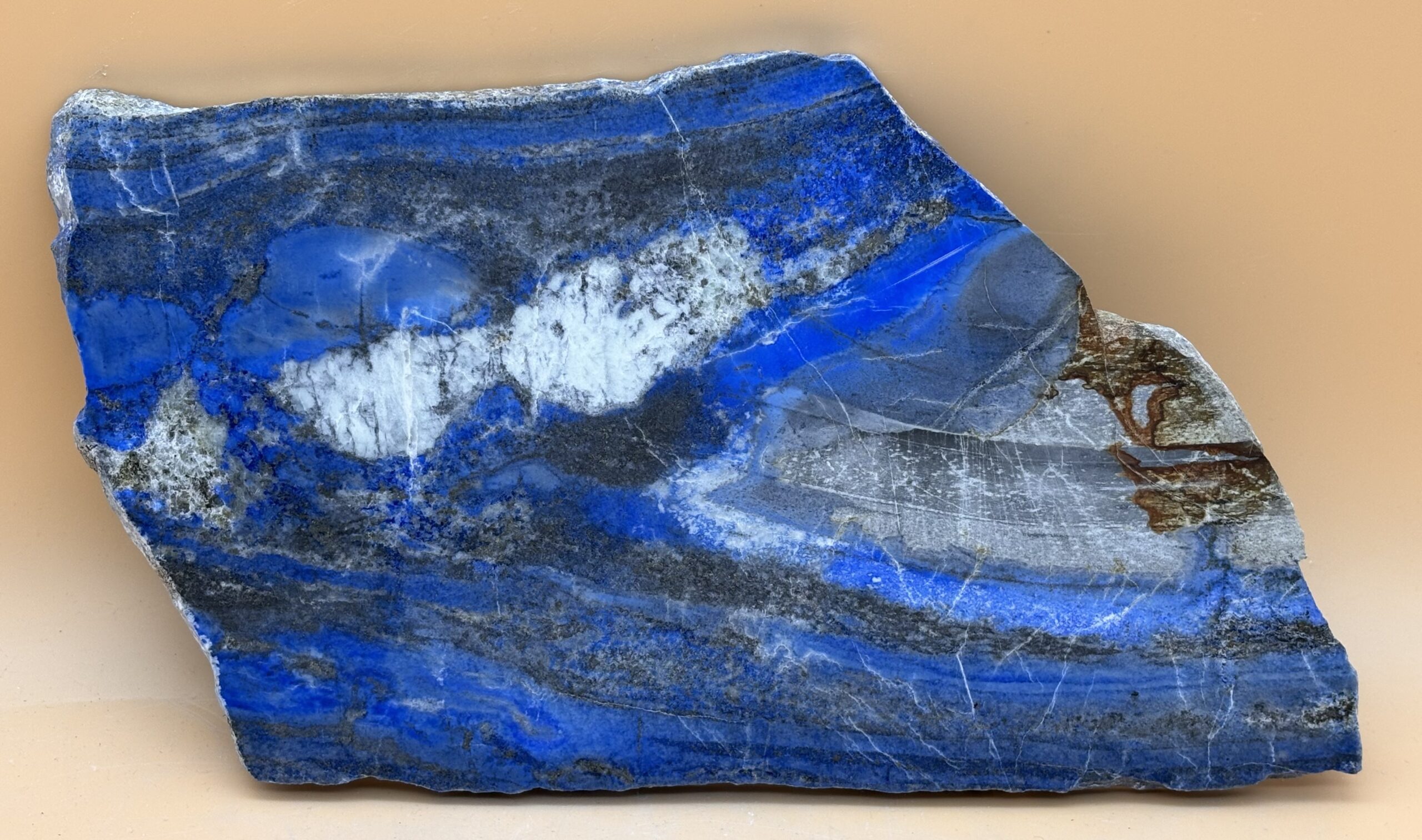 Tektonisch gefaltetes hydrothermales Gestein aus Afghanischem Lapislazuli, Gesteinsplatte mit tonigem Gesteinsfragment das metamorph nicht auskristallisiert ist. Pyritansammlungen an den einzelnen blauen Ablagerungsschichten. Einpressung in Folge einer Tektonischen Verschiebung durch Calcit. Ähnliche Strukturen wurden in Dolomit Steinbrüchen des Val d' Ossola Norditalen gefunden, nur sind die Schichtungen dort Grau-weiß. Das heißt, an Verwerfungszonen, entstehen Hydrothermale Quellen, in denen sich die durch ultra heißes Wasser Mineralien tief im Untergrund lösten und sich in den oberen Ausgängen ablagerten wie heute z. B. im Yellostone zu beobachten ist. Platte beidseitig poliert, Hergestellt in Bad Wörishofen Bayern