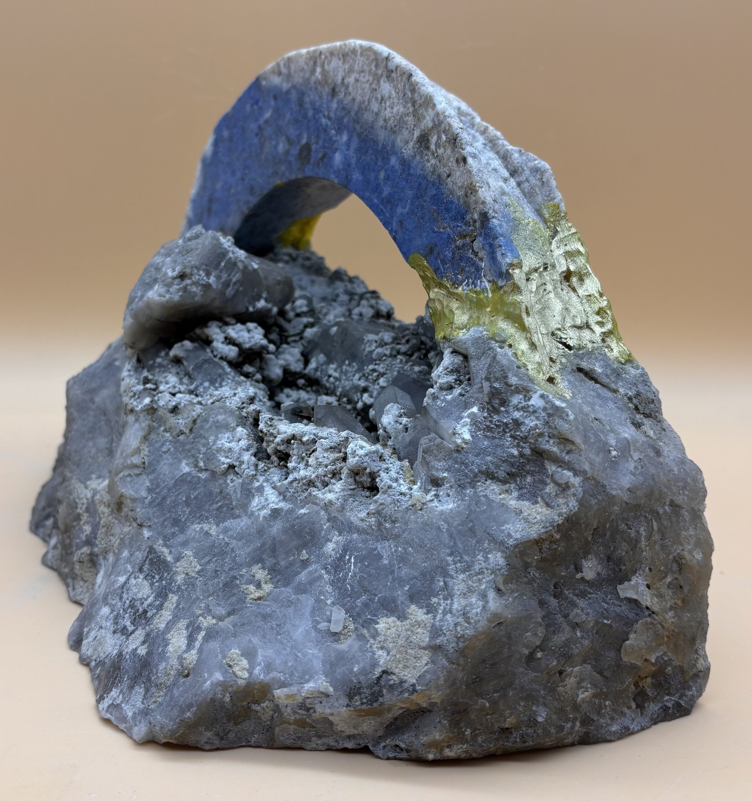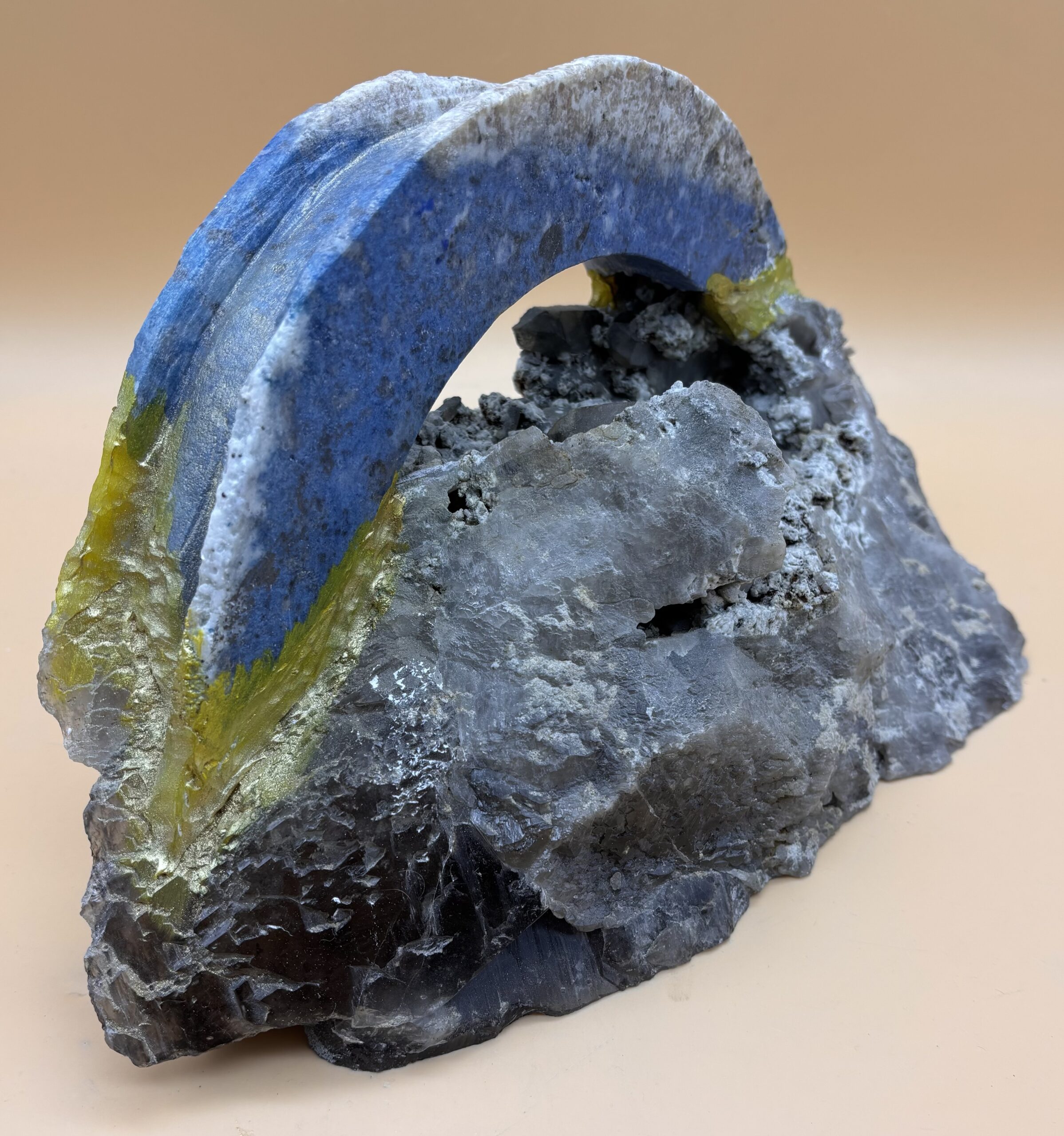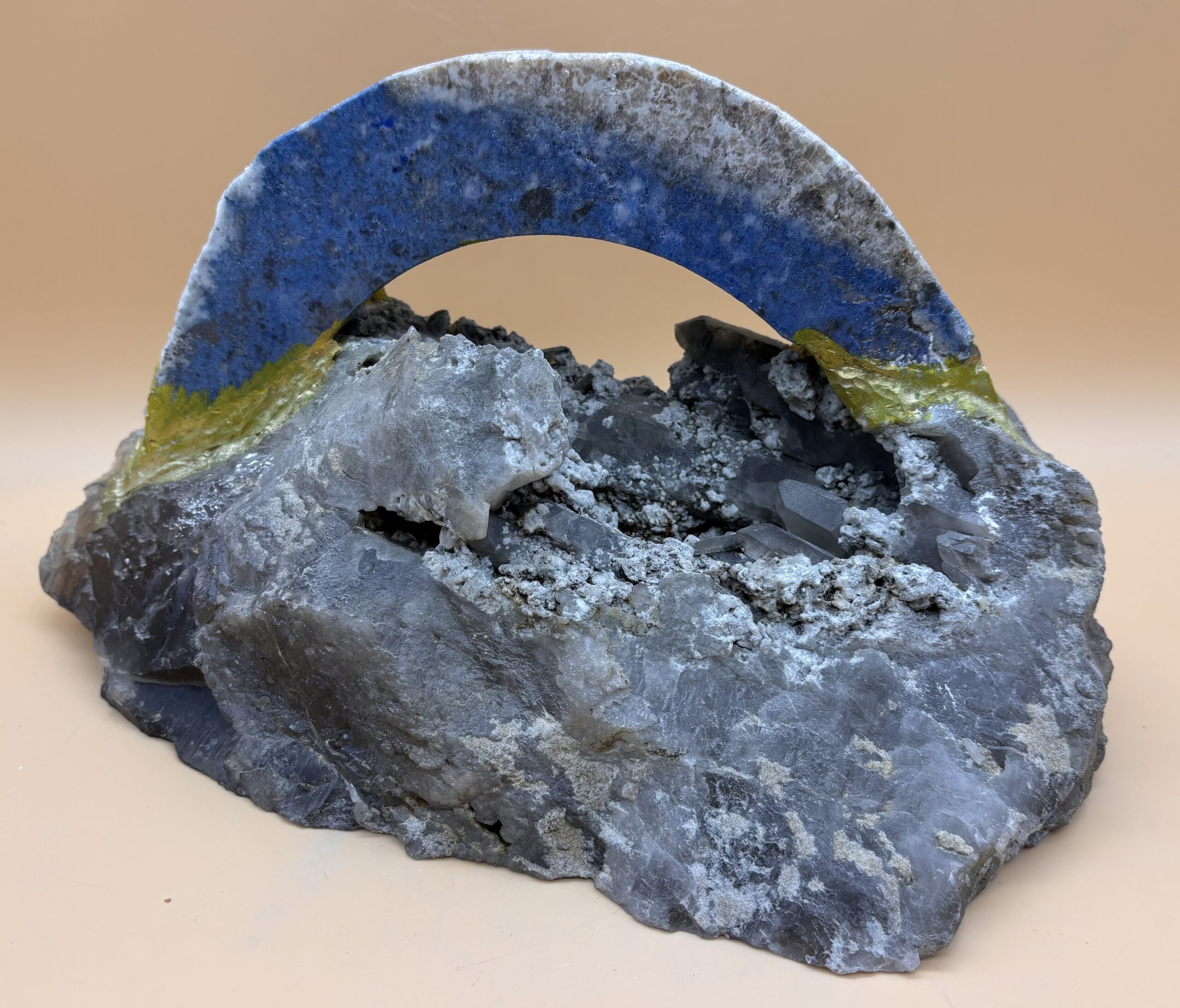 "blaue Regenbogenbrücke" eine Installation aus Lapislazuli und Walliser Rauchquarz, Peter Fraefel Bildhauer