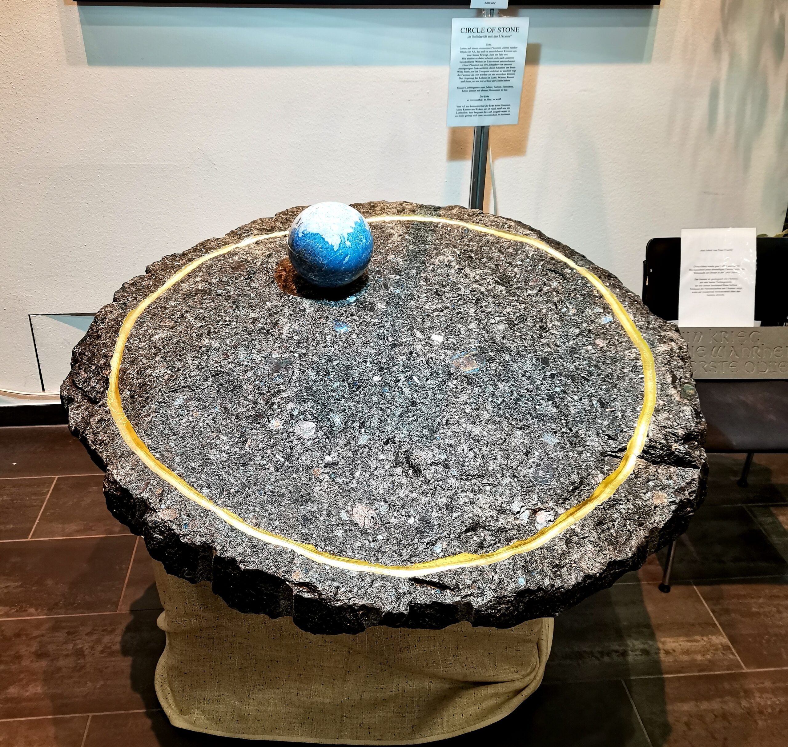 Installation "Bordo dell'universo" oder Rand des Universum, alles dreht sich um eine unsichtbare Kraft. Astronomen sehen keine Bewegung im All, alles ist starr, starr wie Stein. Stein bewegt sich, bewegt sich durch unsichtbare Kräfte. Die Erde ist aus Stein, sie bewegt sich ohne das wir es sehen in einer Bahn um die Sonne. Die Sonne bewegt sich durch unsichtbare Anziehungskraft vom Mittelpunkt der Milchstrasse, einer unsichtbaren unvorstellbaren Kraft, die Ursprung und Untergang sein wird. Lapislazuli-Kugel auf gespaltenem Tiefengestein mit vergoldeter Ring-Nut Steinbildhauer Peter Fraefel