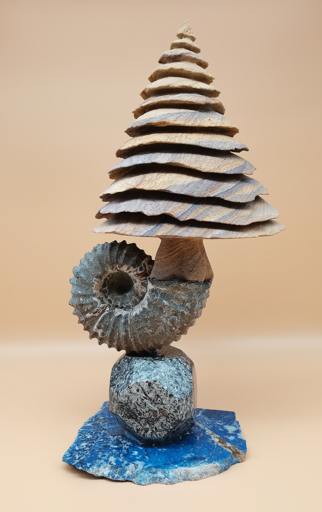 "der Atem des Ammonit" ist eine Suggestion auf alles was lebt und lebte. Das Leben hier auf dem Außenposten der Milchstraße ist einzigartig. Der Forschung nach, entstammen wir Einzellern, die aus mineralischen Lösungen sich entwickelten konnten. Aus Einzellern wurden Mehrzeller wie Algen und Plankton. All jene produzierten Sauerstoff für die Atmosphäre und produzierten Stickstoff und CO2 durch Verdauung und Verfall des Körpers. Pflanzen und maritime Lebewesen brachten diese Komponenten in Umlauf, so das sich heutiges Leben erst auf den Kontinenten etablieren konnte. Das Leben ist eine Spirale wie das Gehäuse des Ammoniten. Rainbow-Quarzsandstein auf Ammoniten-Fossil und Hornblendeschiefer von der alpinen Faltungszone im Walliser Binntal, Basisplatte Lapislazuli Peter Fraefel Steinbildhauer