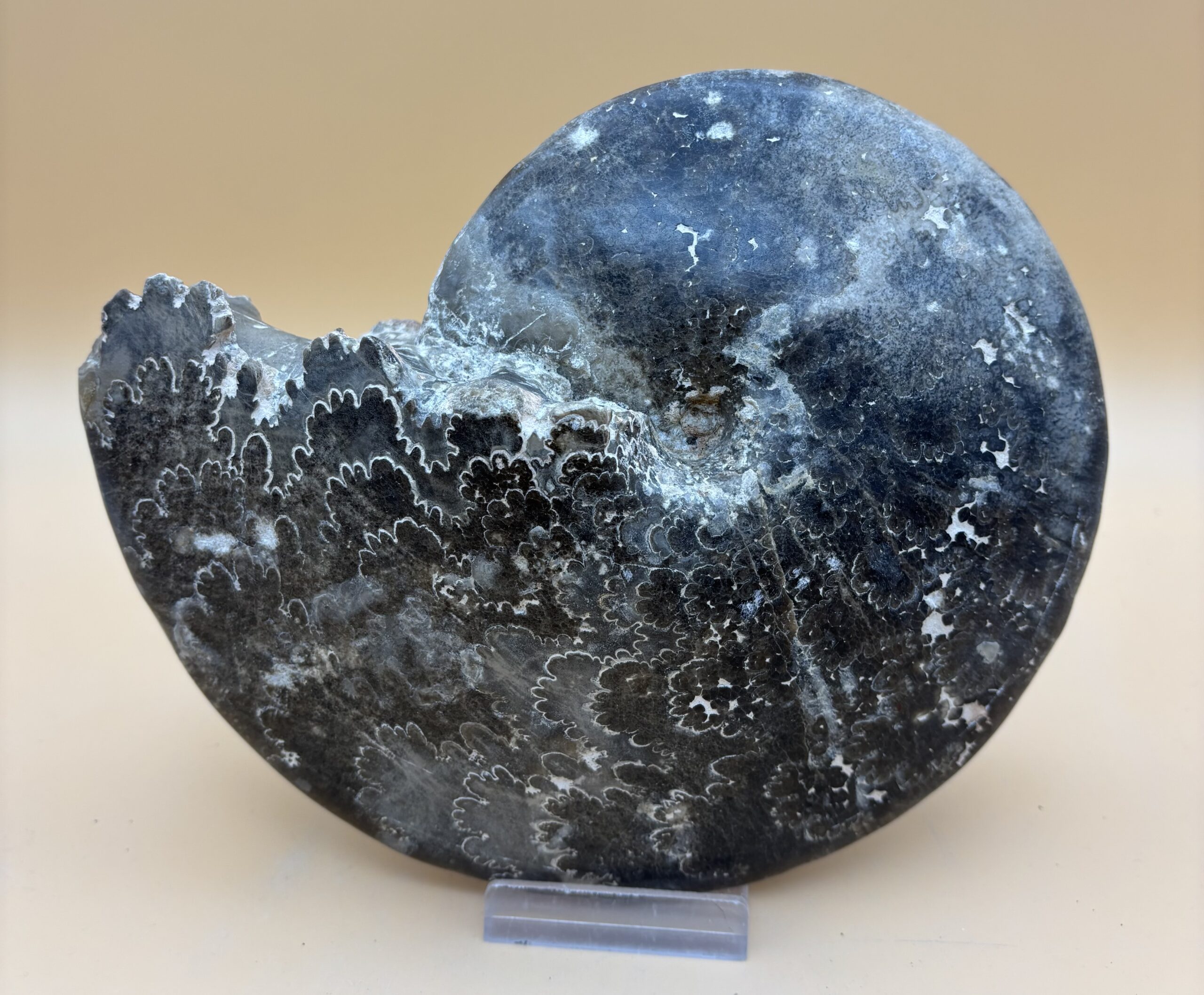 Diskuvelitis war eine Ammonit-Art ( ausgestorbener Kopffüßler ) des Jura-Zeitalters. Die Namensgebung rührt daher, da er die Form eines Diskus hat und Ammonit kommt von der Alt- Ägyptischen Hauptgottheit Ammon, der mit einem Widderkopf dargestellt wurde. Sehr schön sind auch die sogenannten seitlichen Lobenlinien, die jede Kammer kennzeichnete. Je barocker die Kammergrenzen waren, desto tiefer konnte der Ammonit tauchen. Fundort : Hoher Atlas Marokko