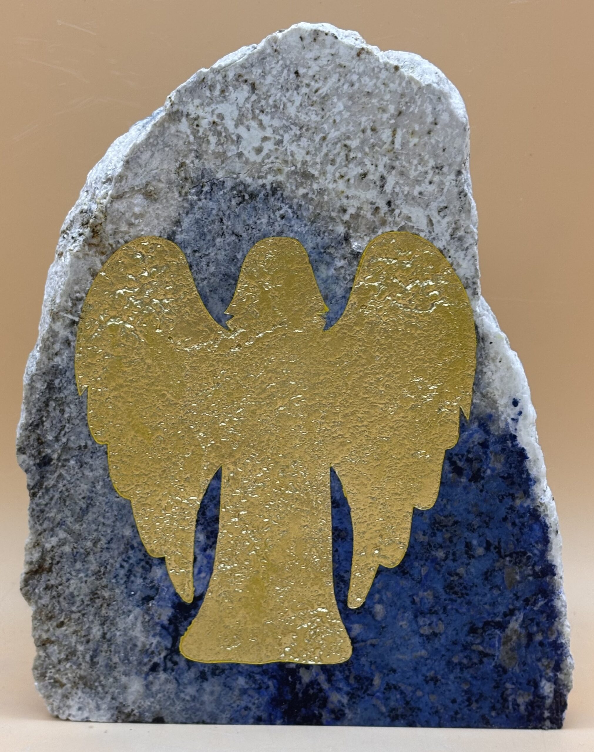 Afghanischer Lapislazuli mit eingraviertem , M-vergoldetem Engel, Oberfläche poliert, Rückseite Natur