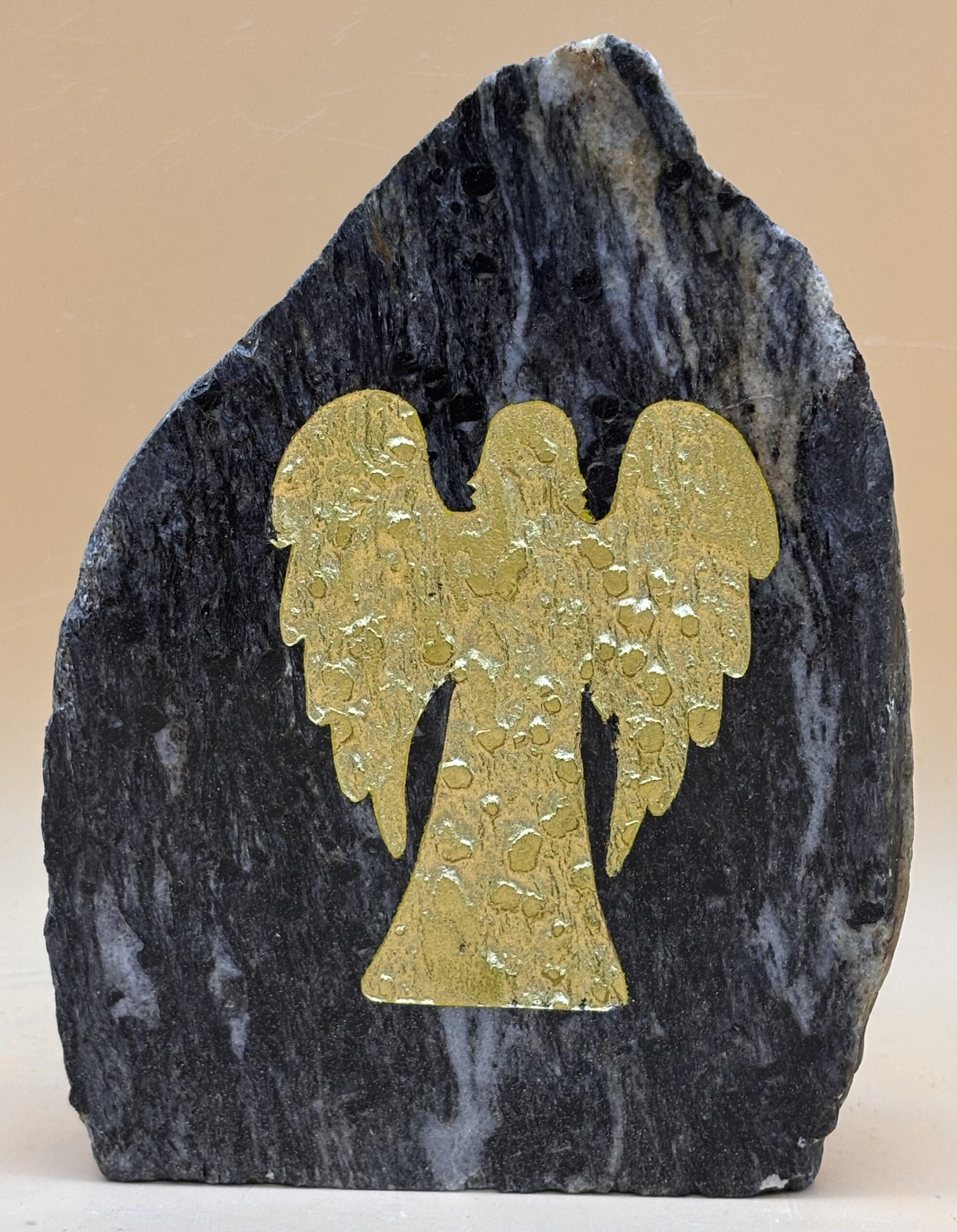 Engel in Bündner-Schiefer aus dem Binntal / Wallis / Schweiz, Engel M-vergoldet, Oberfläche poliert, Seiten Natur, Schweizer Handarbeit