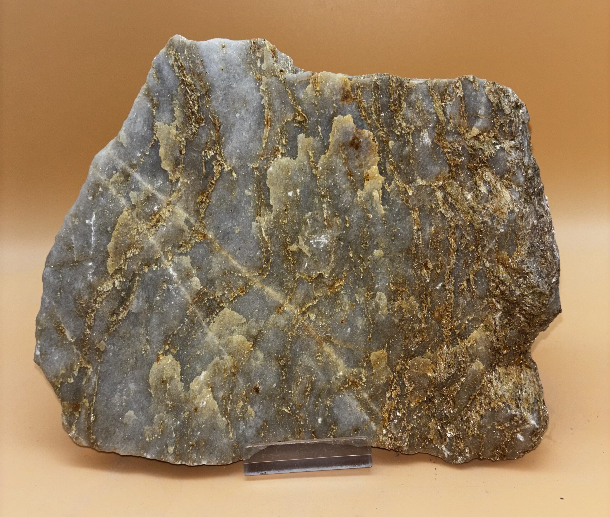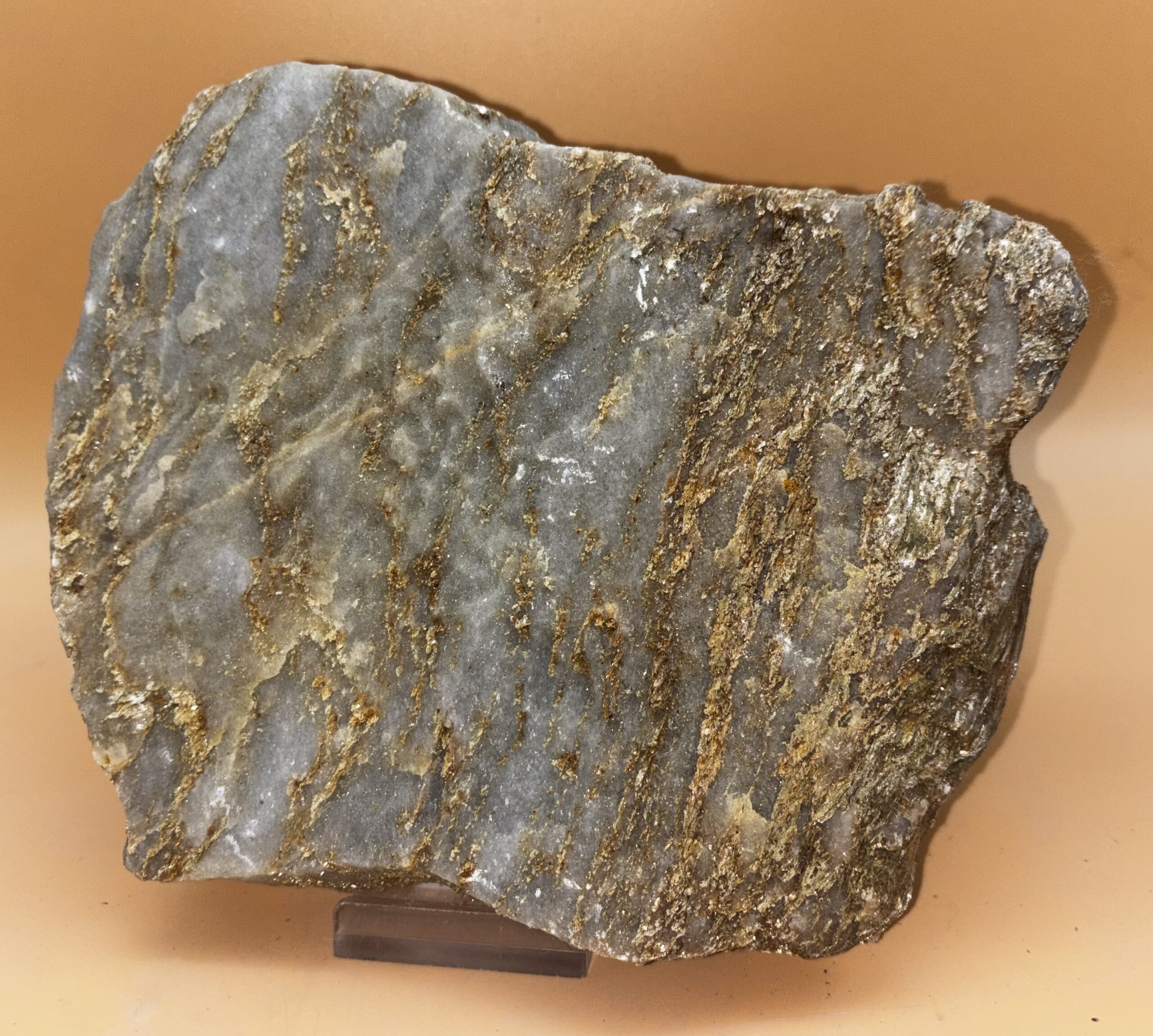 sehr harter metamorpher Gletscherbach Glimmer-Dolomit. Die Besonderheit liegt im Klang, wenn man über diesen Stein streicht, sind akustisch feine helle Töne wahrzunehmen. Auch optisch durch das Funkeln von goldenen und silbernen Glimmertönen eine Augenweide. Fundort: Binntal / Wallis / Schweiz