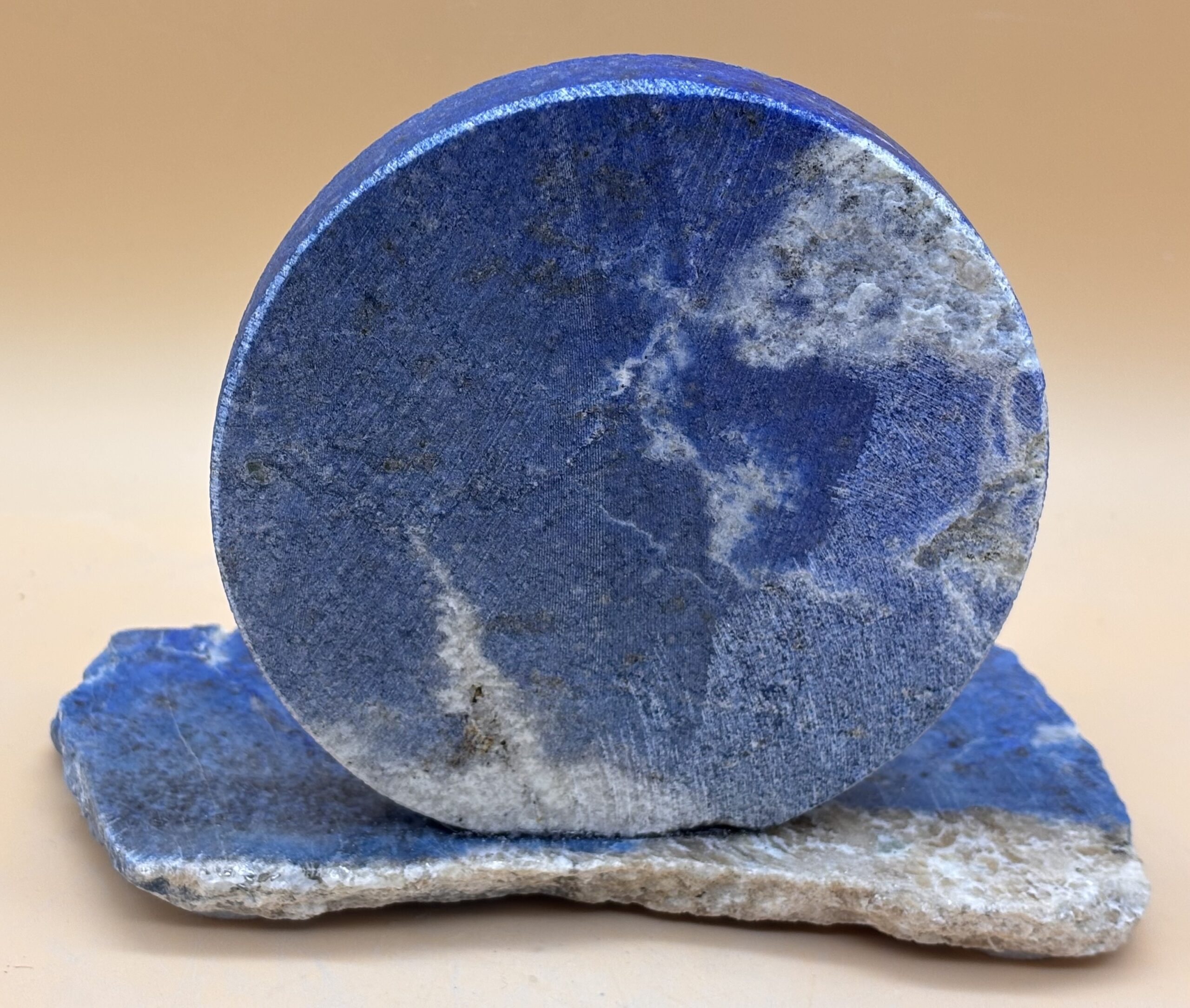 Walliser Goldmarmor-Engel auf türkisblauer Lapislazuli-Scheibe, Oberfläche poliert und geschliffen, Basis mit Naturkante, Handarbeit aus Bayern
