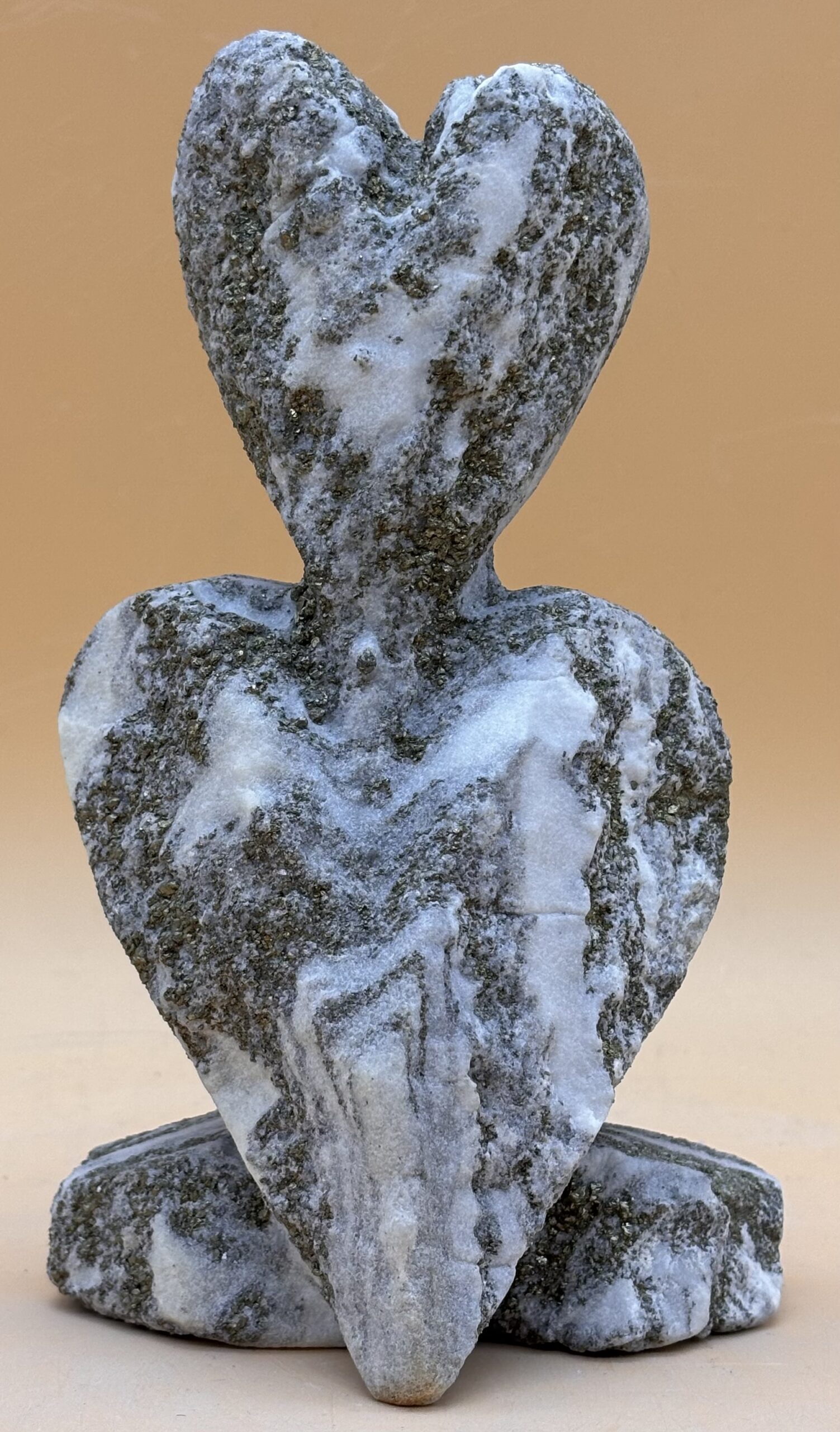 in Handarbeit geschnittene Walliser Goldmarmor Herzen aus dem vollen Gestein, Oberfläche jetgestrahlt, Pyritreiches Dolomit-Gestein, Schweizer Handarbeit