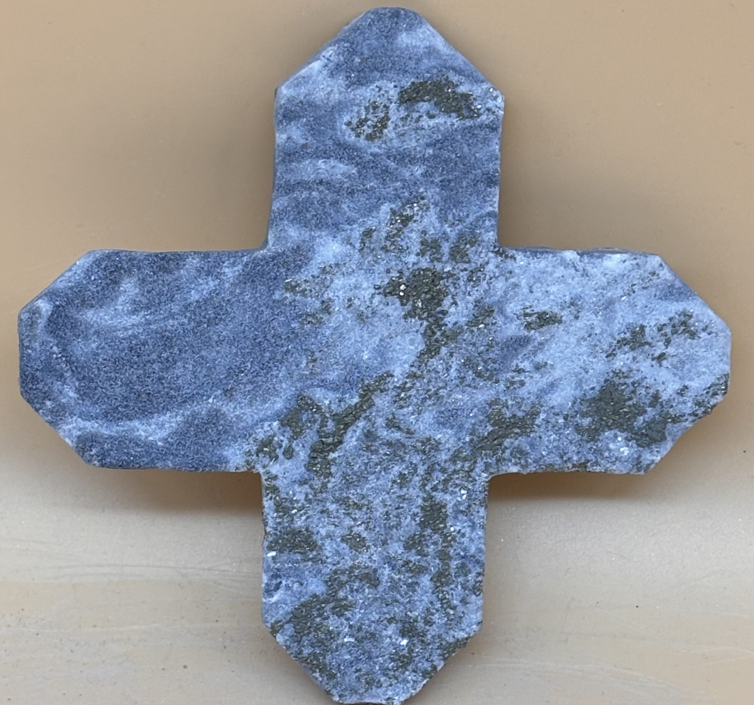 aus Walliser Goldmarmor geschnittenes Steinkreuz. Dolomitmarmor mit goldglänzendem Pyrit. Schweizer Handarbeit
