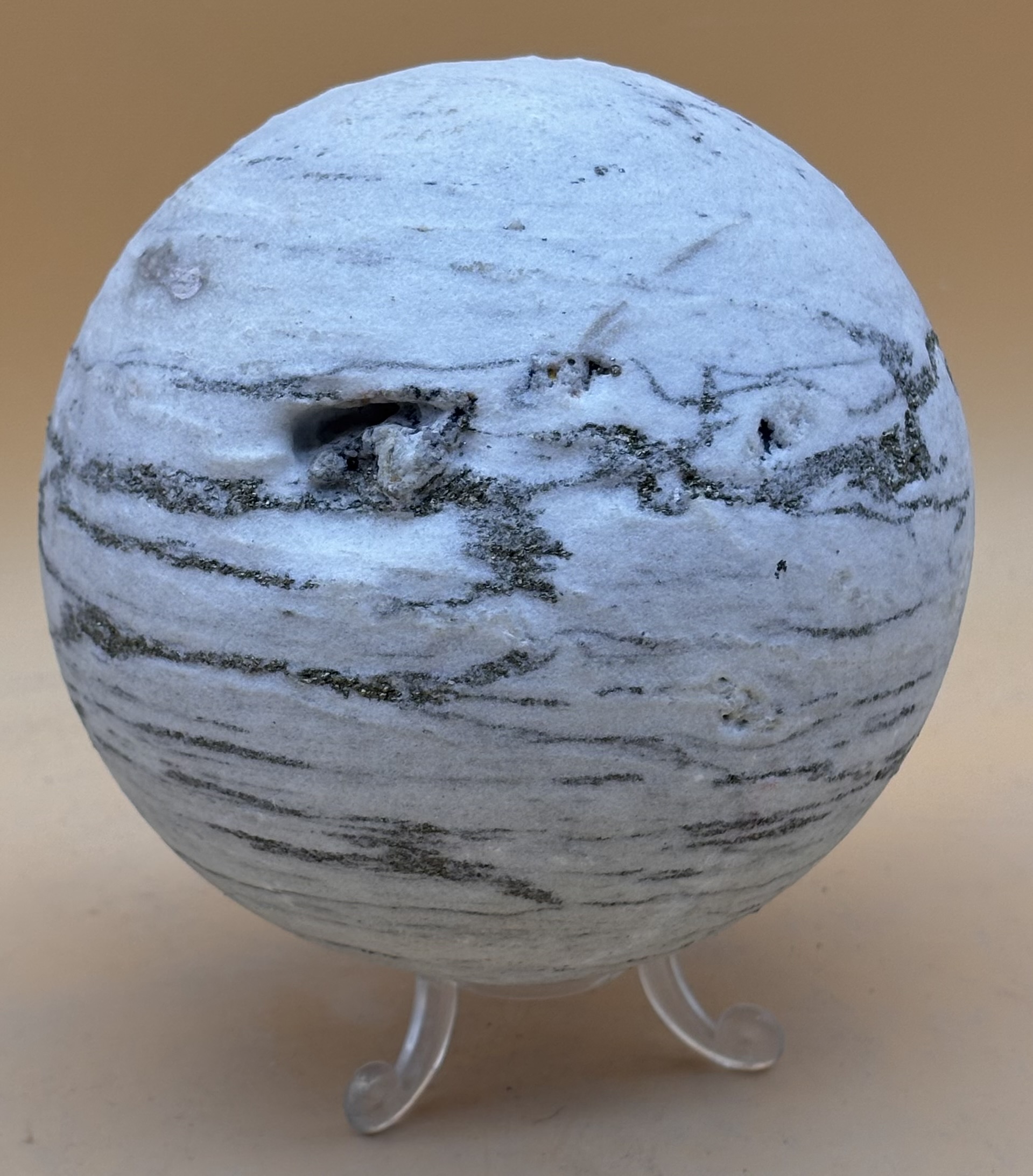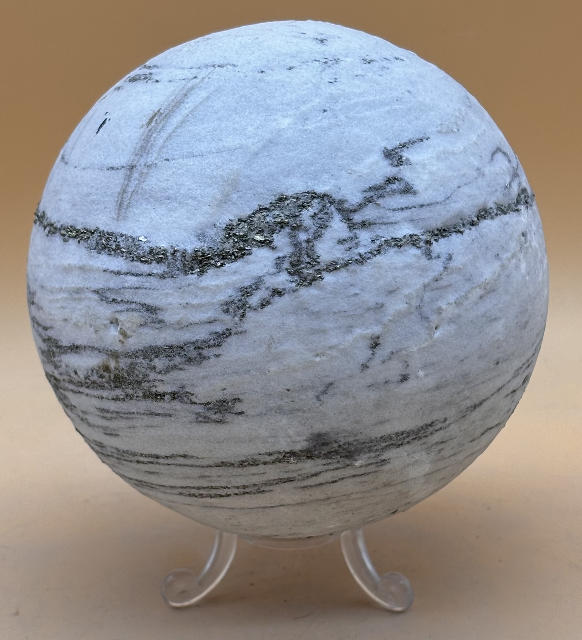 Walliser Goldmarmor Kugel, Pyrit, metamorpher Dolomit und Calcite dominieren das Gestein, Rohstein Herkunft: Binntal Schweiz, Oberfläche jetgestrahlt, Schweizer Handarbeit
