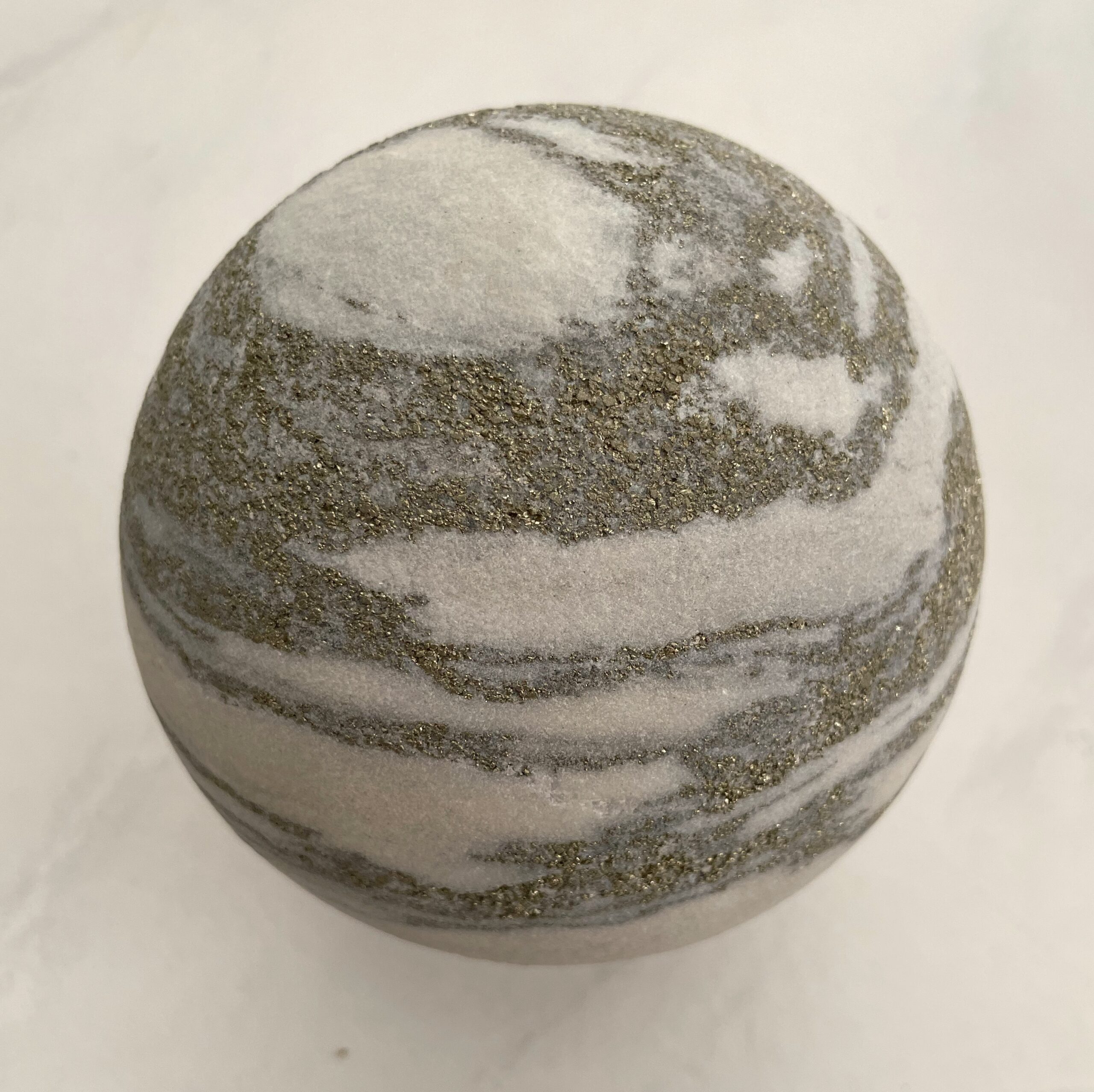 Walliser Goldmarmor-Kugel, Oberfläche jetgestrahlt, Rückseite mit verschlossener Scherschichtung, Goldmarmor ist ein kristallines seltenes Pyrithaltiges Dolomitgestein aus dem Walliser Binntal das heute nicht mehr abgebaut wird.