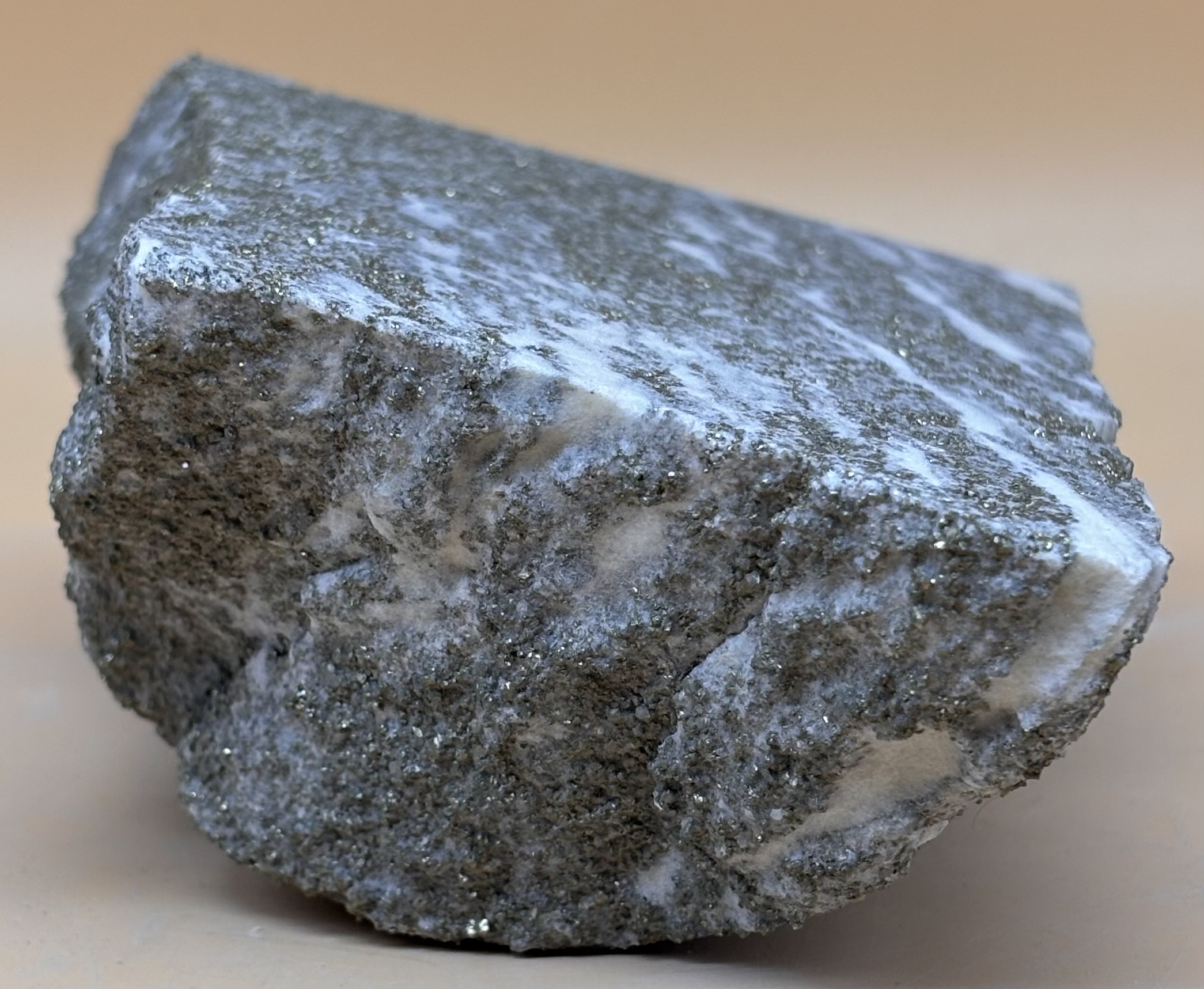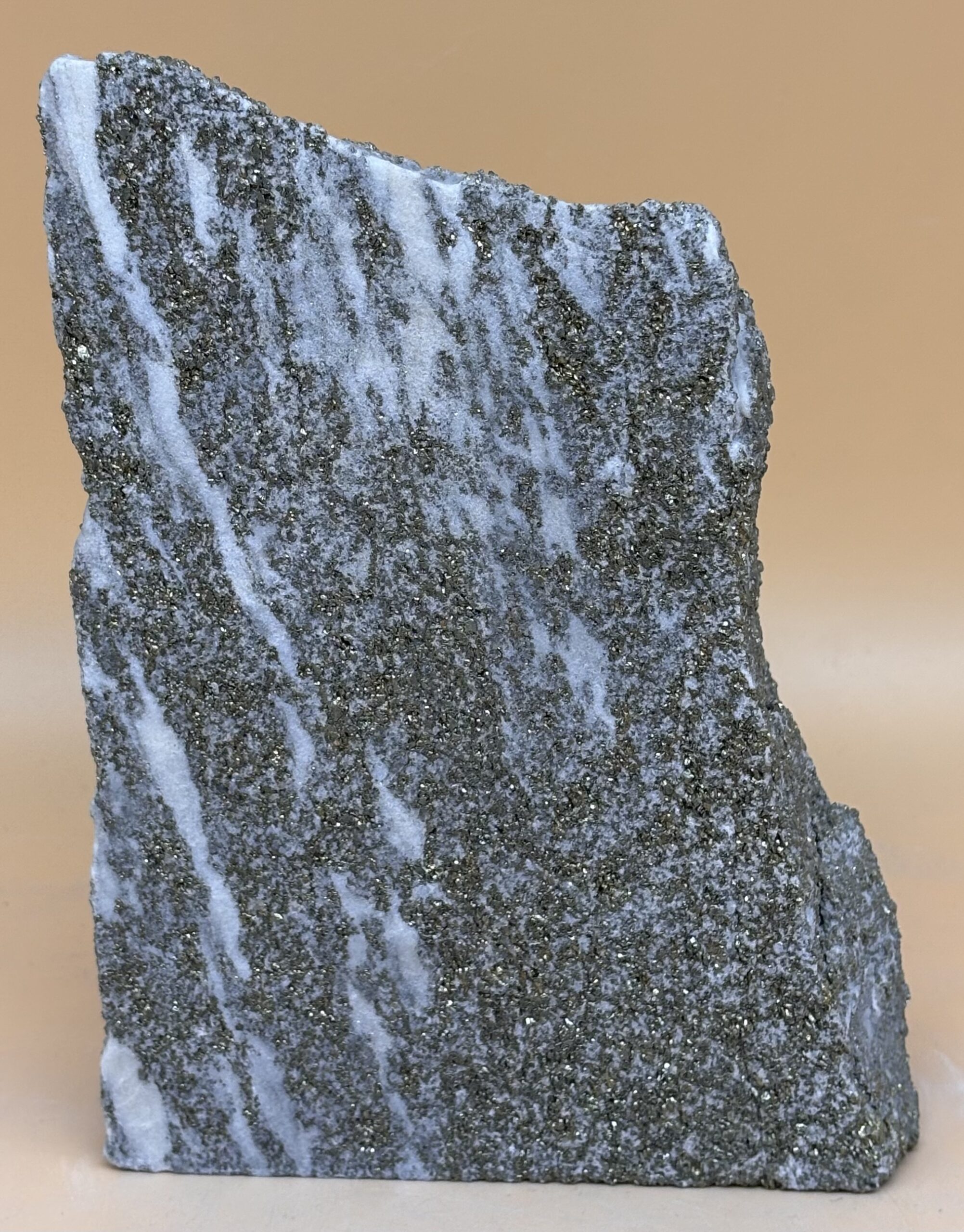 auch Lengenbach Dolomit in Mineralienkreisen genannt. Stark Pyritreiches Mineraliengestein aus der Grube Lengenbach im Binntal. In diesem metamorphen Dolomit Gestein sind bisher über 200 neue Micro-Mineralien gefunden worden, die es sonst noch in keiner anderen Mineralien Fundstelle der Erde gab. Solche Pyritreiche Stücke sind mittlerweile selten. Oberfläche jetgestrahlt, damit der Pyrit stärker hervor tritt.