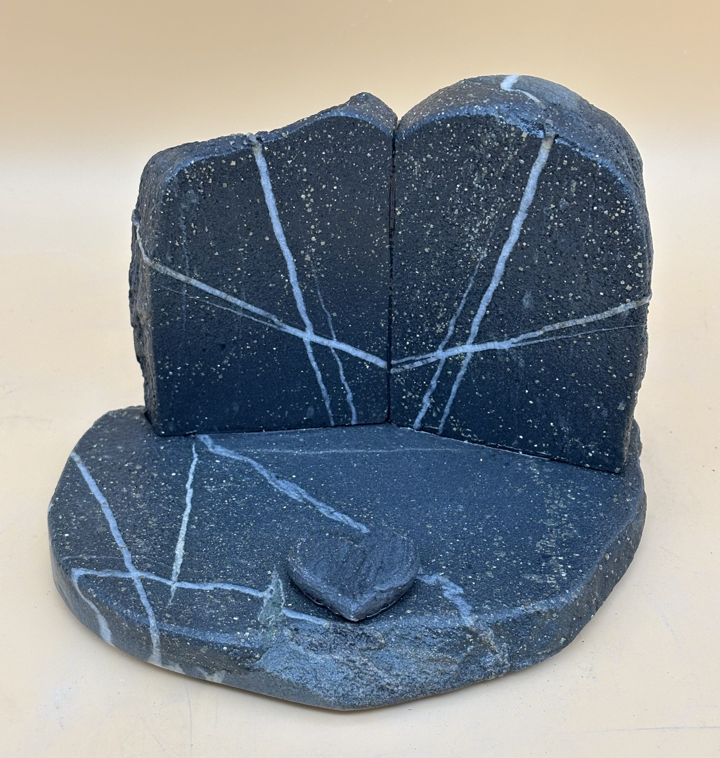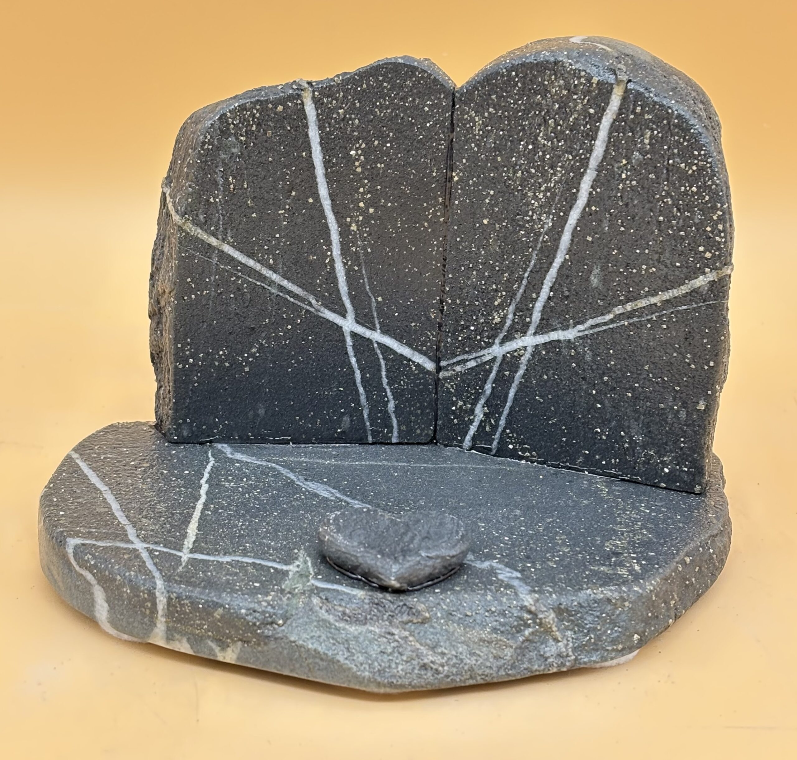 Pyritschiefer aus einem Seitenbach des Hinter-Rhein in Graubünden in neuem Gewand. Die Bachkiesel mit den Pyriteinschlüssen sind nur mit geübten Auge sichtbar, um festzustellen ob sich was daraus machen liesse. Bei diesem Kiesel hat es sich gelohnt ihn aufzuschneiden. Optisch und mit ein wenig Fantasie erkenne ich einen nächtlichen Sternenhimmel, in denen Kometenschweife ihre Bahnen ziehen. Natürlich mit Herz und Liebe handwerklich hergestellt.