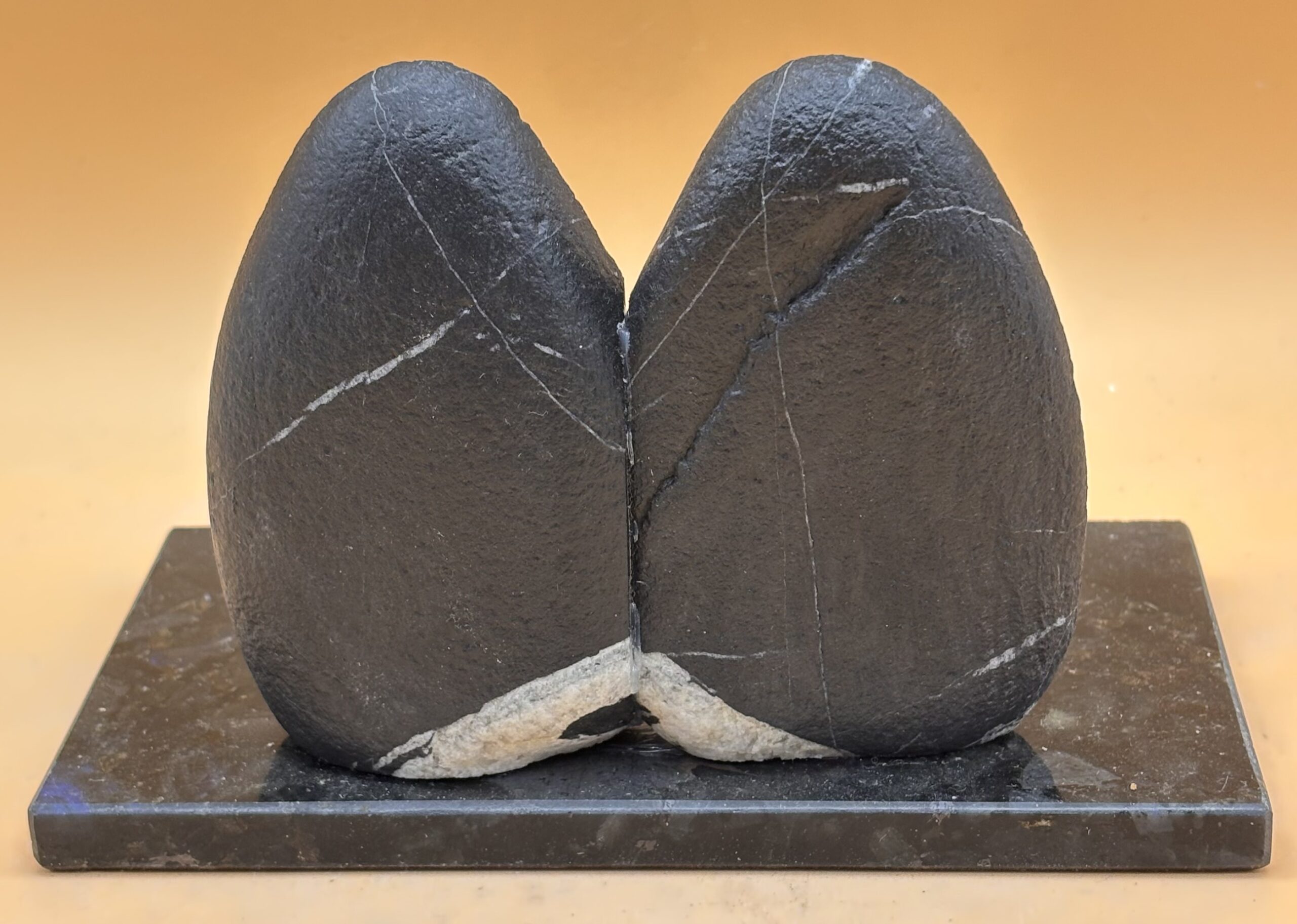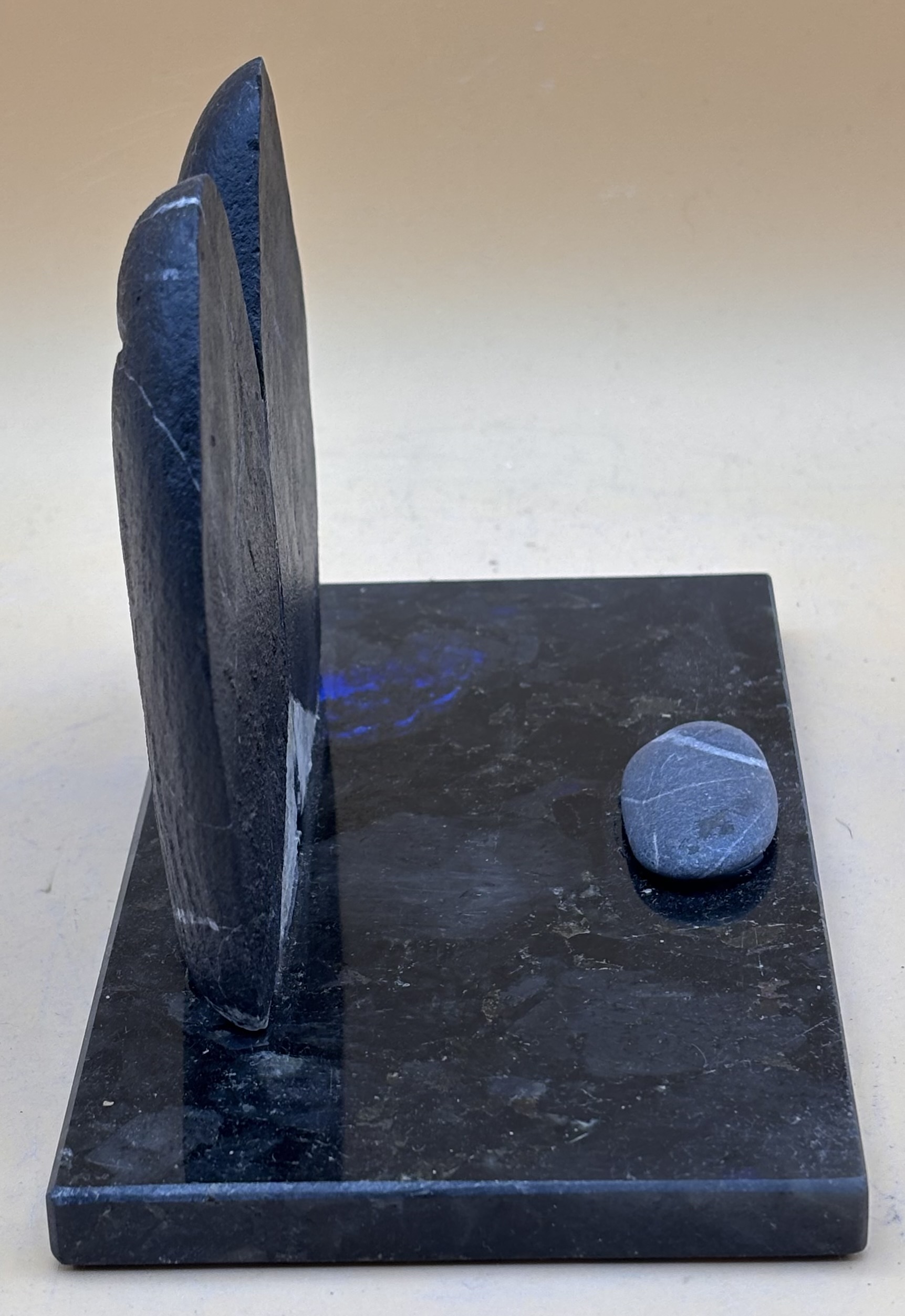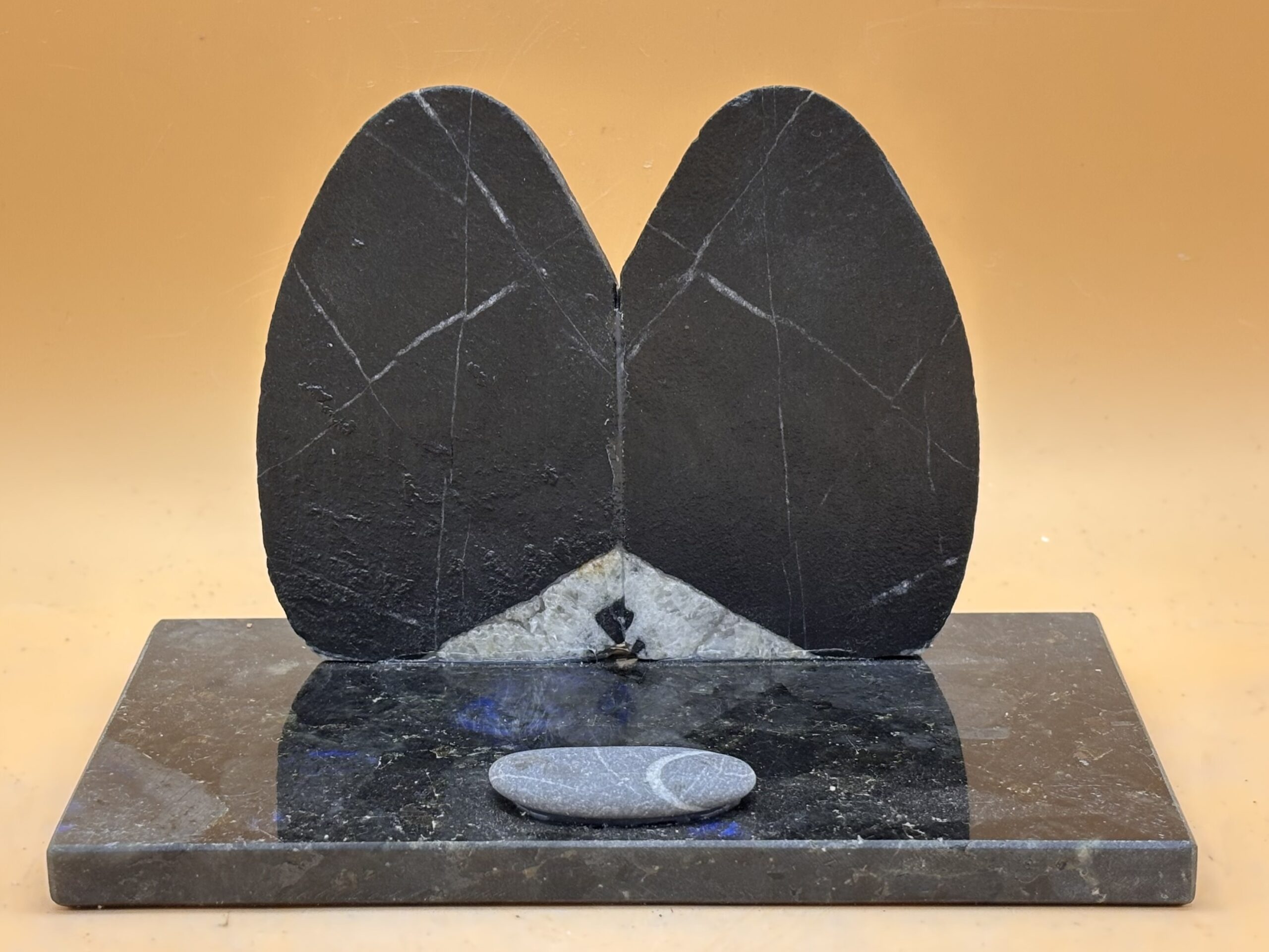 für Leute die den Rhein lieben ! Ein Handyständer aus Graubündener Rheingoldschiefer, klassisch elegant, auf antrazit-schillerndem, poliertem Artic Blue Spectrolit, Made im Allgäu Bad Wörishofen
