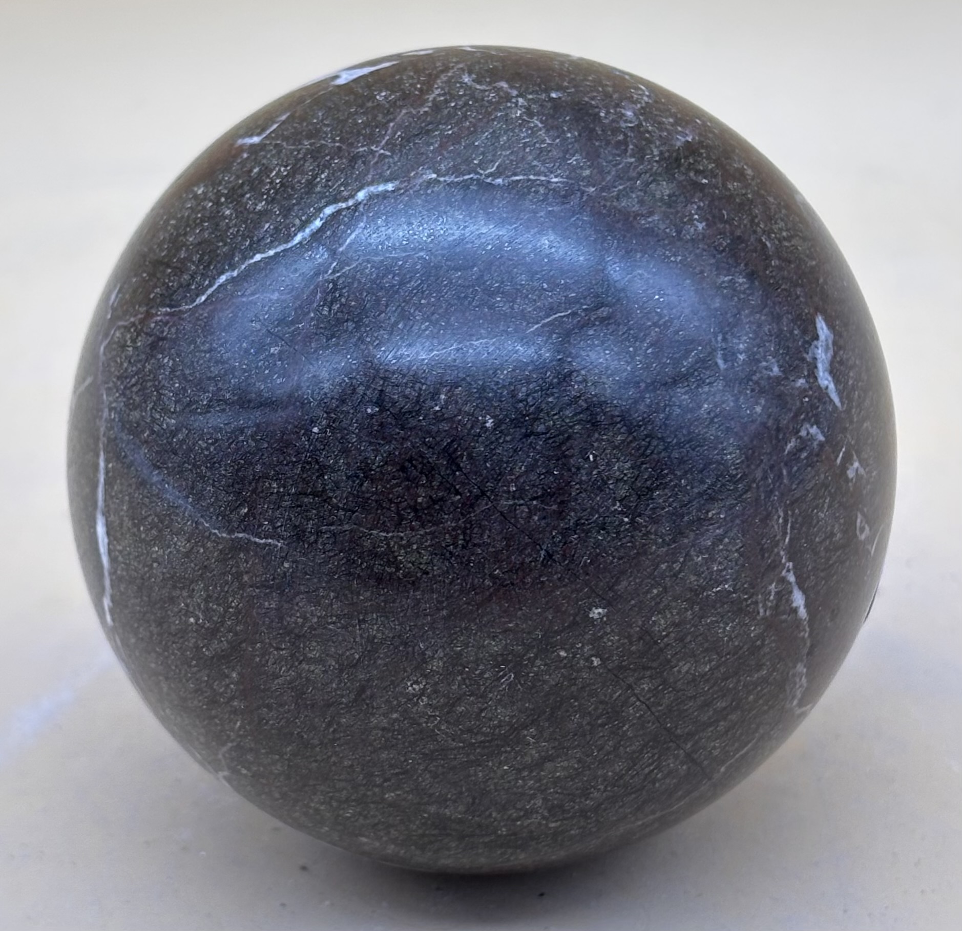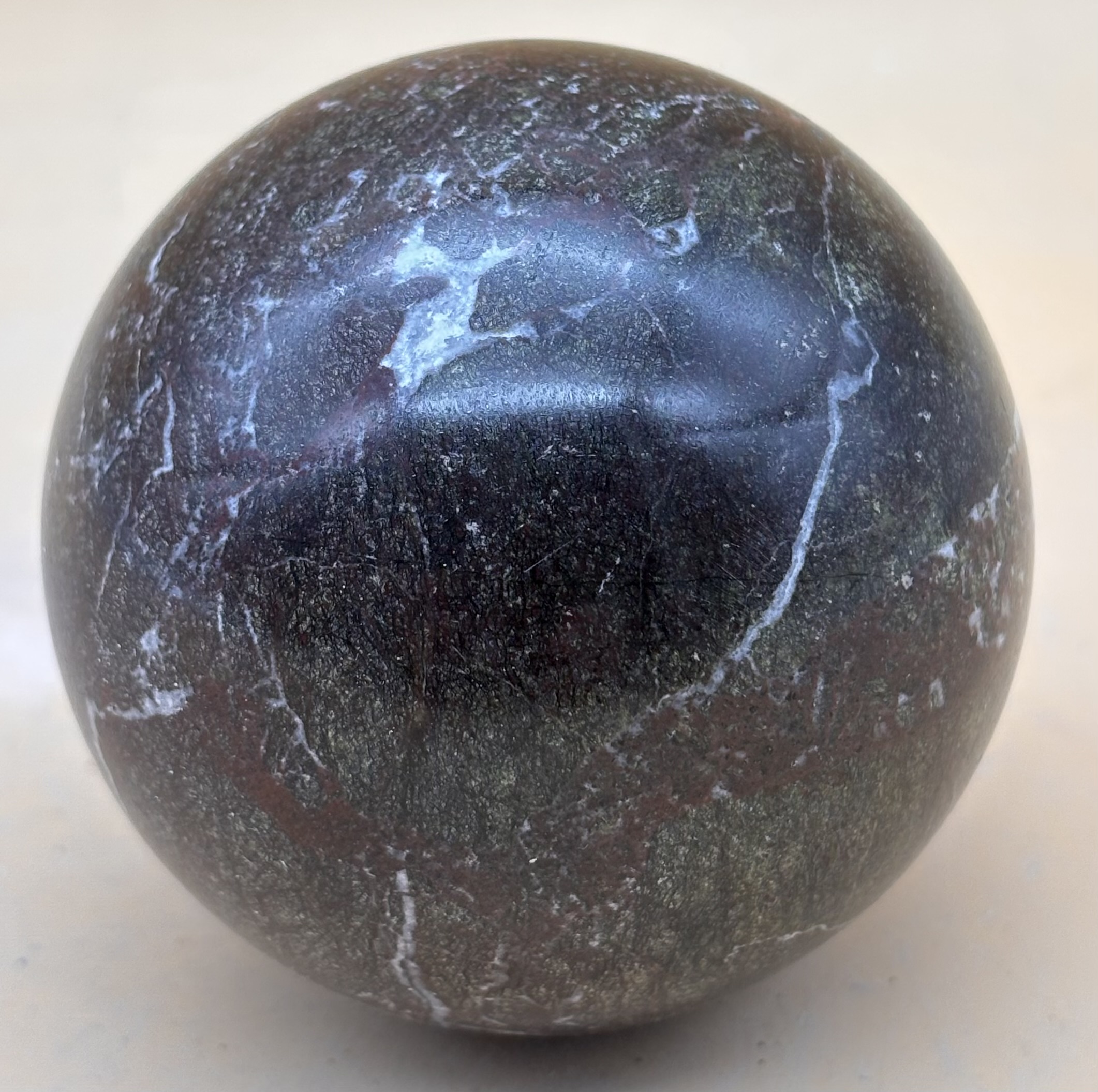 aus einem Lech-Kiesel des Forgensee bei Füssen hergestellte rote Kalkstein-Breccien-Kugel, Oberfläche poliert
