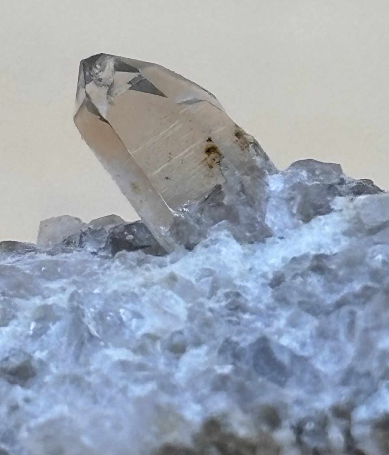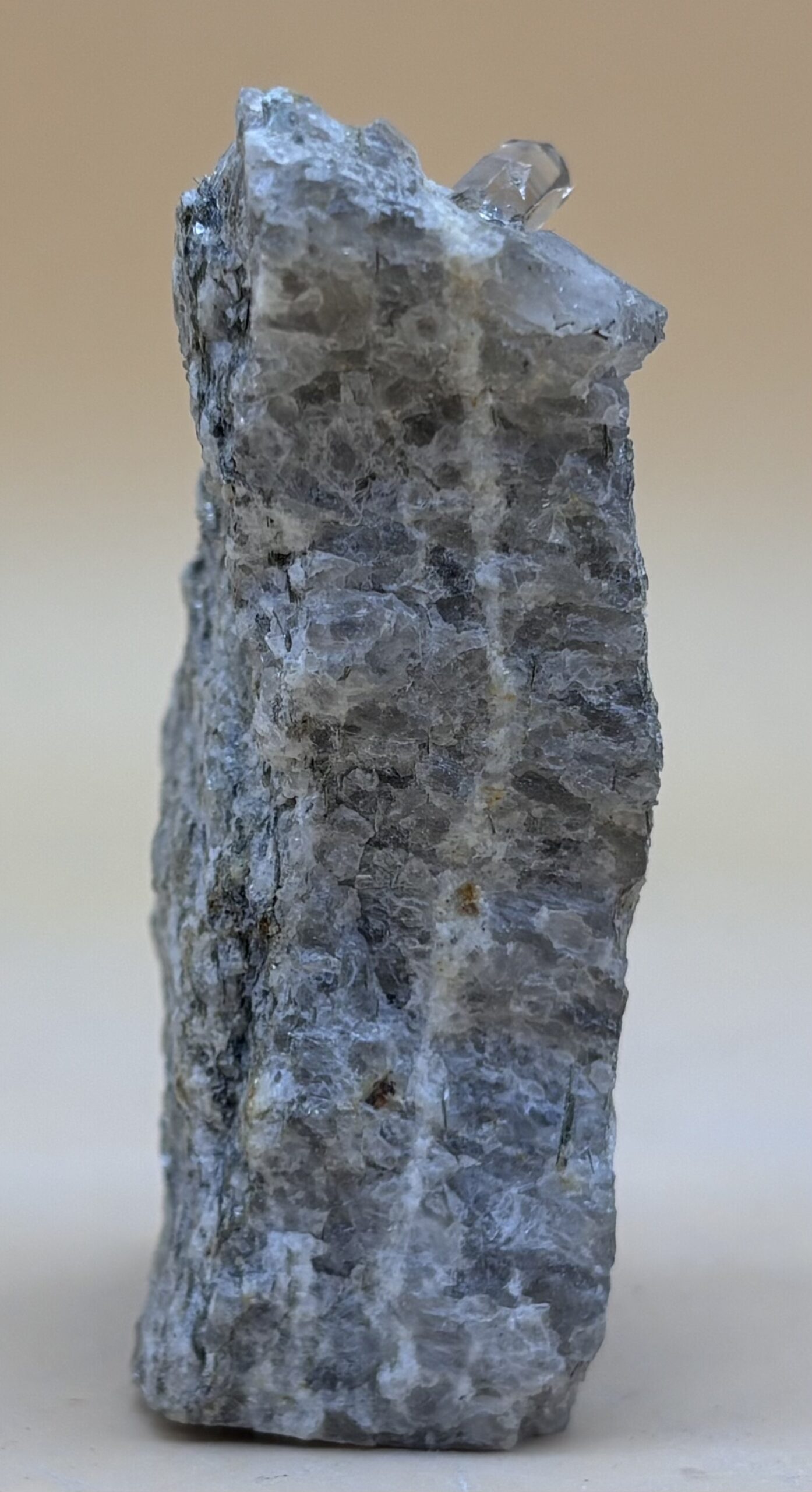 aus einer Zerrkluft im anstehenden Gneis geborgener kleiner Rauchquarz auf Quarzreicher Kluftfüllung. Fundort: Walliser Binntal