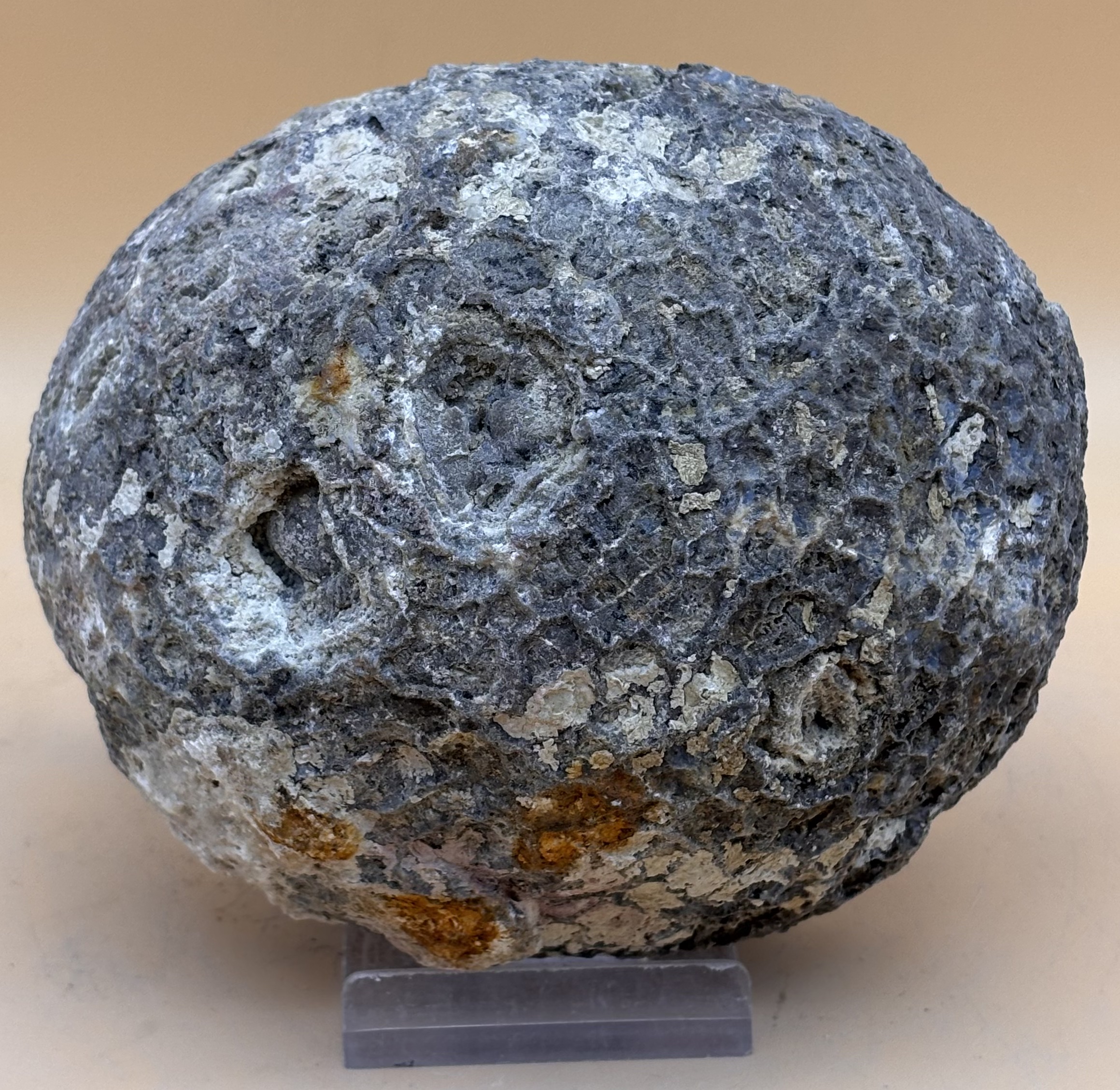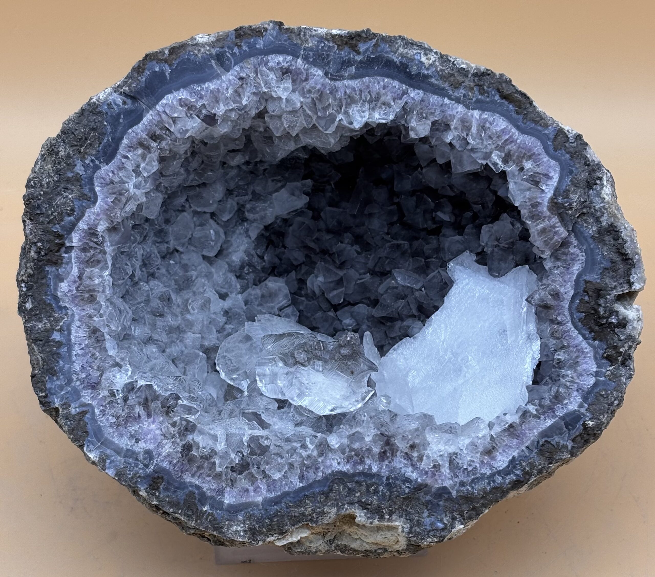Kristall Geoden entstehen in Gasreicher Magma die sich in Ablaufkanälen unterhalb der Oberfläche abkühlt. Die Gasblasen in der erstarrten Magma füllen sich im Laufe der Jahrtausenden mit feinster Kieselsäure die jeden Hohlraum der Gesteinsmatrix erreichen. Auch andere gelöste Mineralien wie der Calcit kann in solchen Hohlräumen in tafeliger und die Kieselsäure in Berg- und Amethyst-Kristallformen expandieren. Dieses Exemplar kommt aus Mexiko