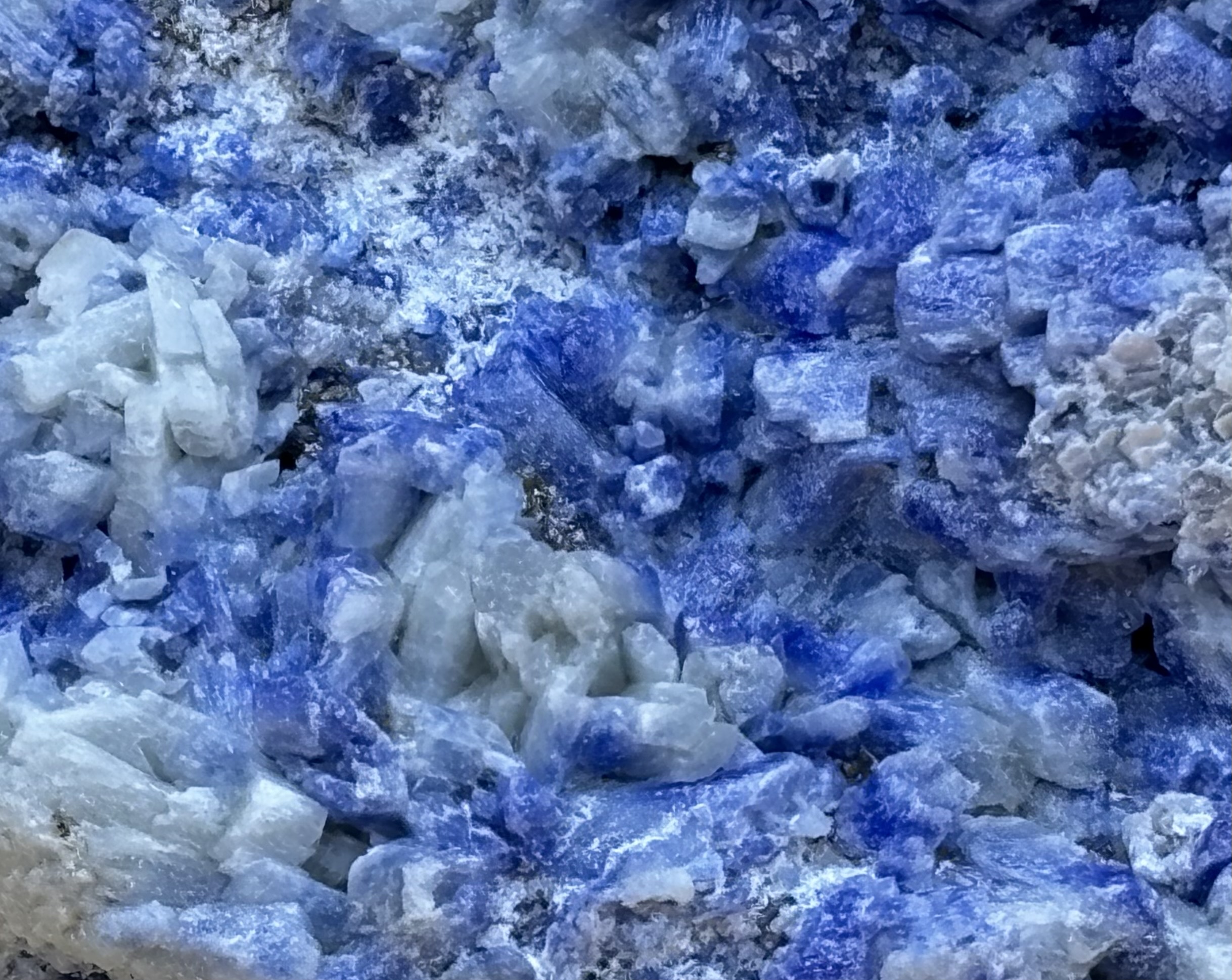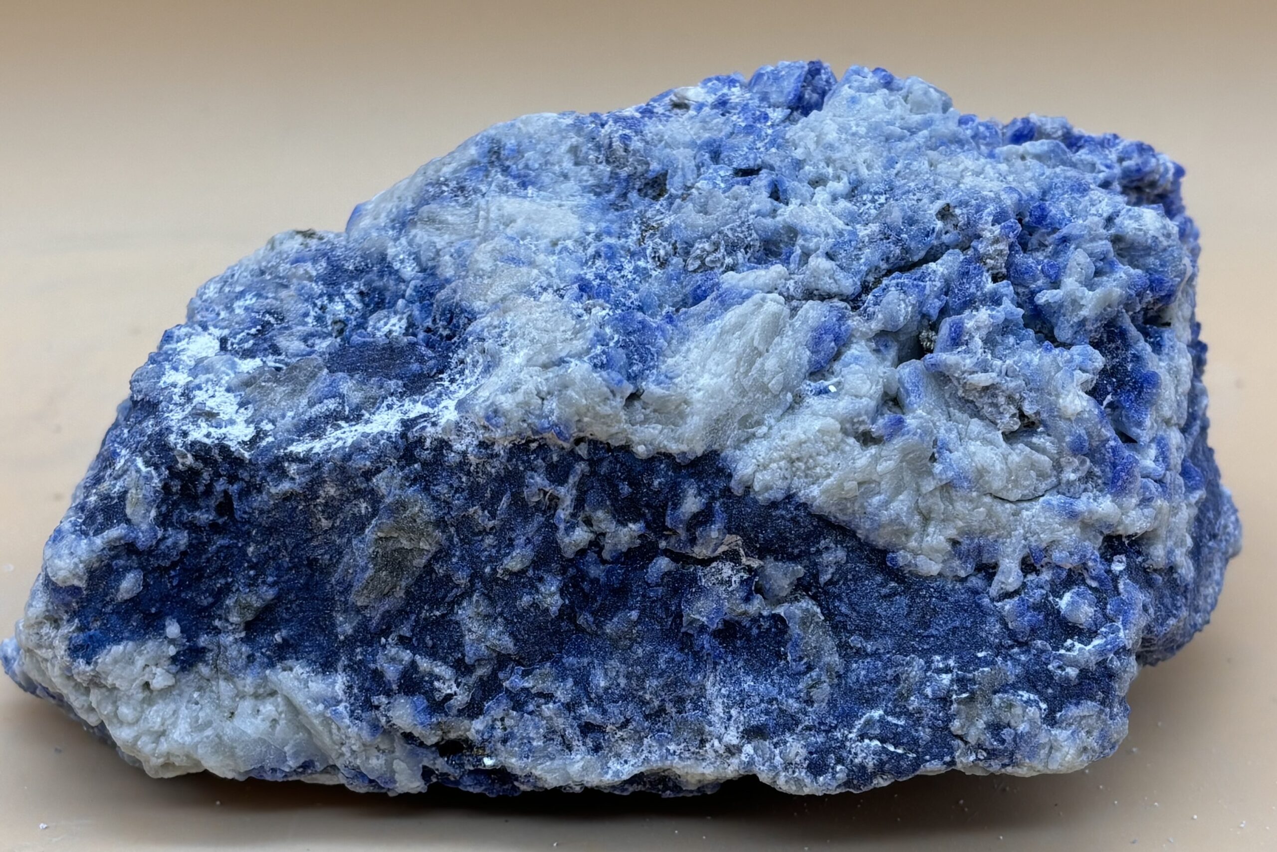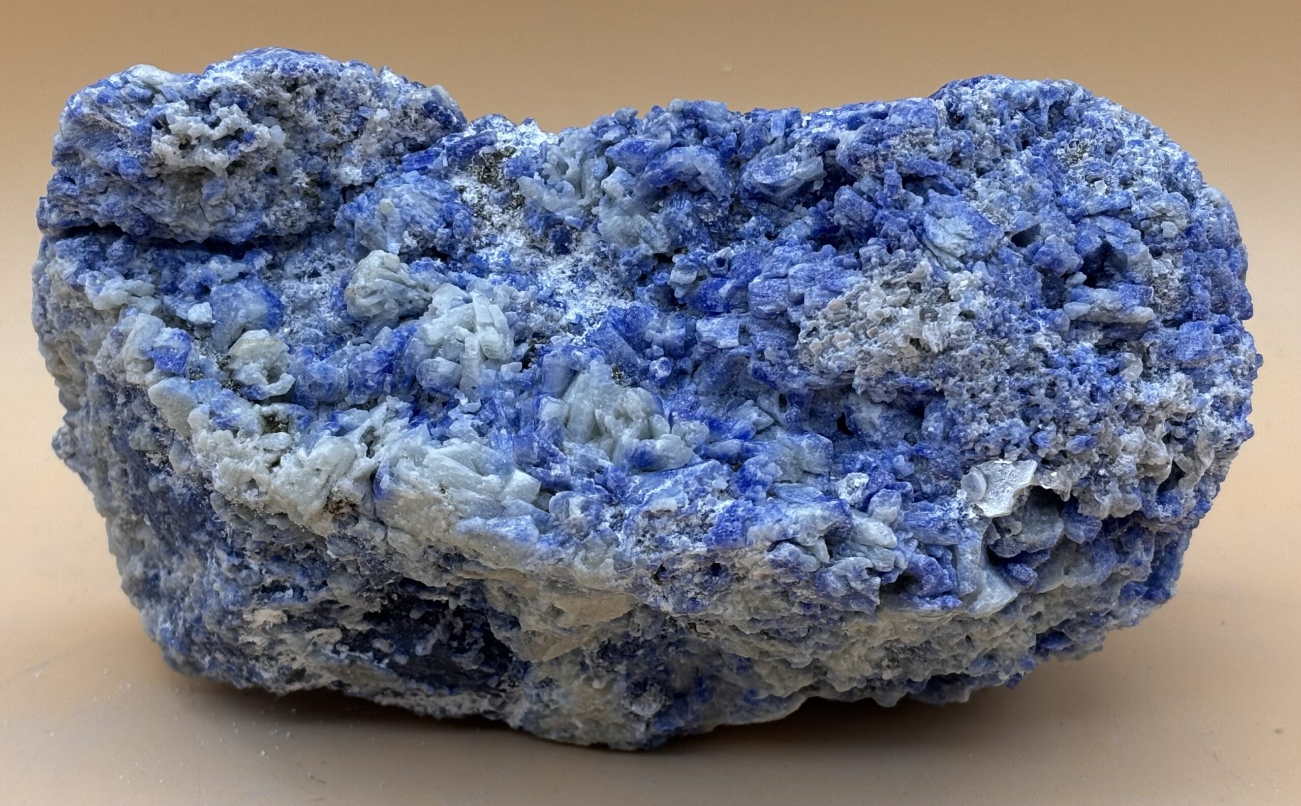 kristalliner Afghanischer Lapislazuli Rohstein mit blauer Matrix und feinen zum Teil blau-weißen Calcit-Kristallen. Sehr schönes und seltenes Sammlerstück