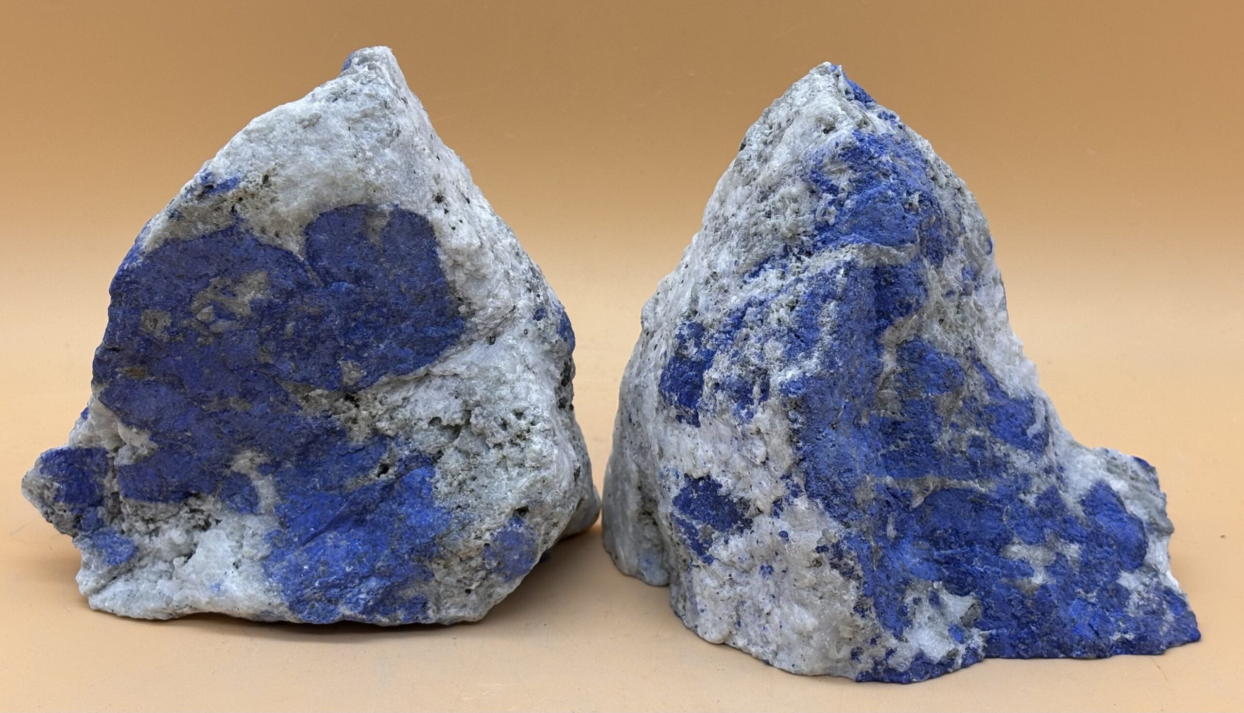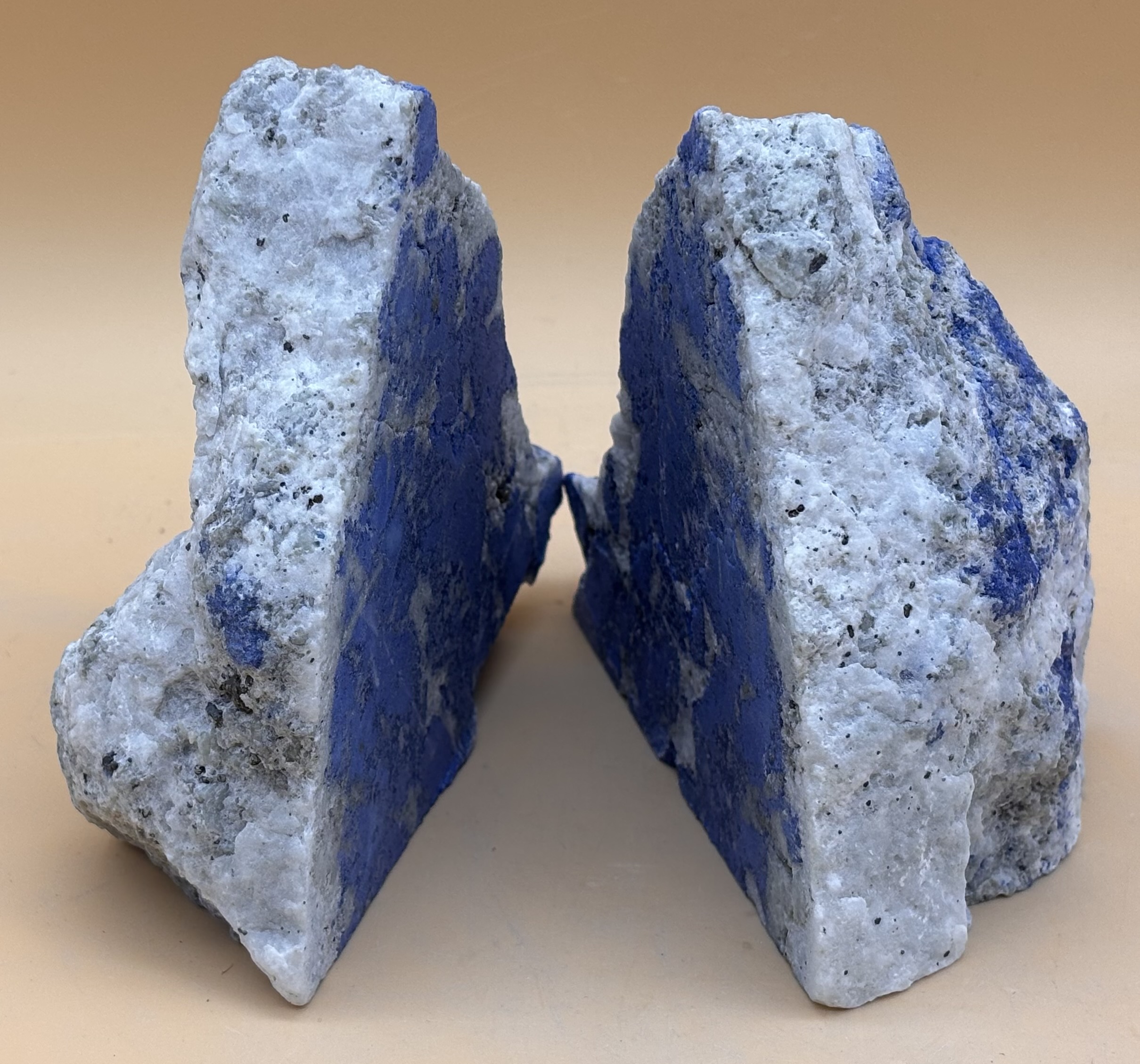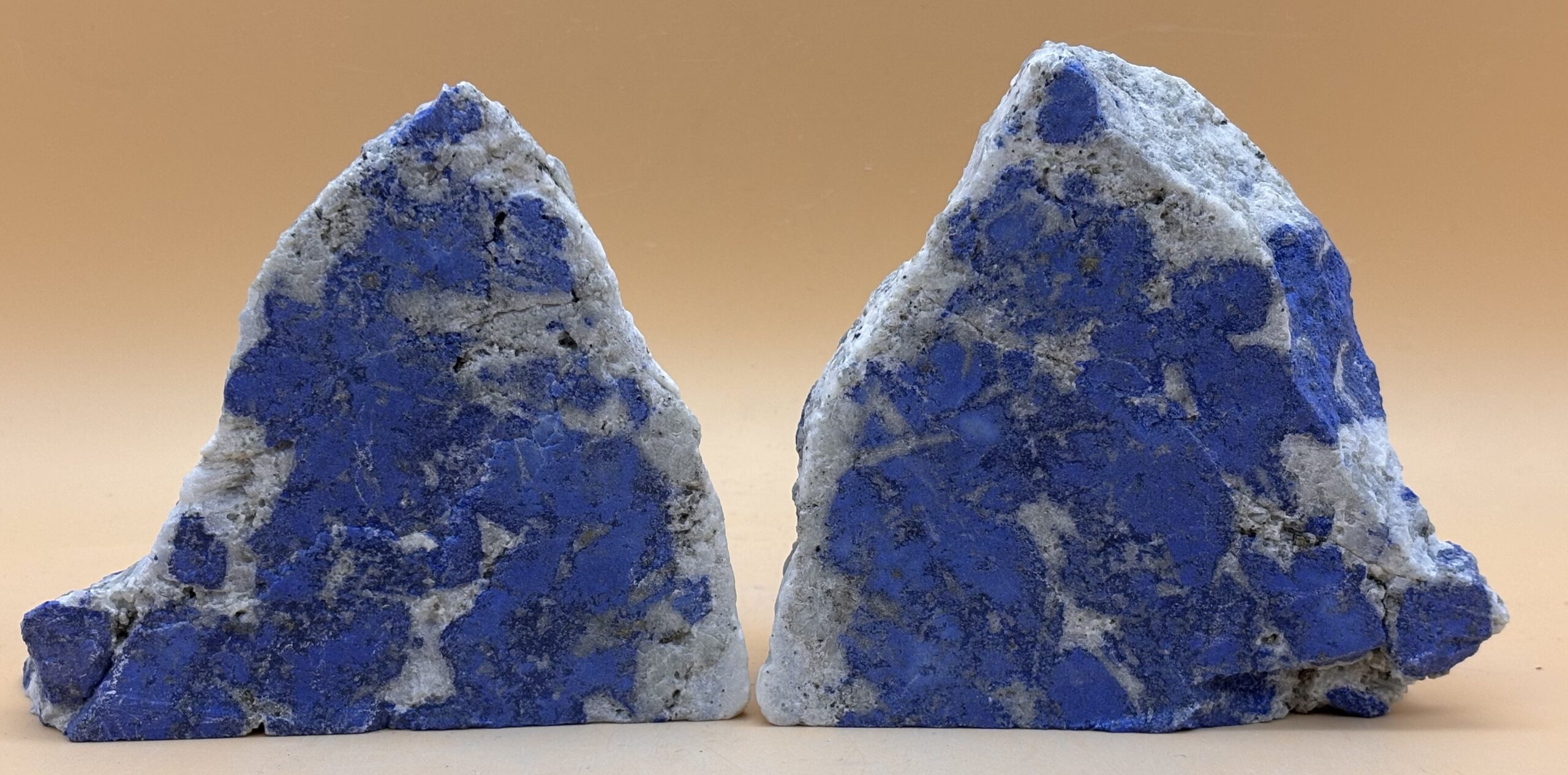 Afghanischer Lapislazuli Rohstein, Spiegelschnitt, Oberfläche gestrahlt, Rückseite Naturkruste, Strich auf rauer Keramik : Blau, Struktur knollig blau im weißem Calcit