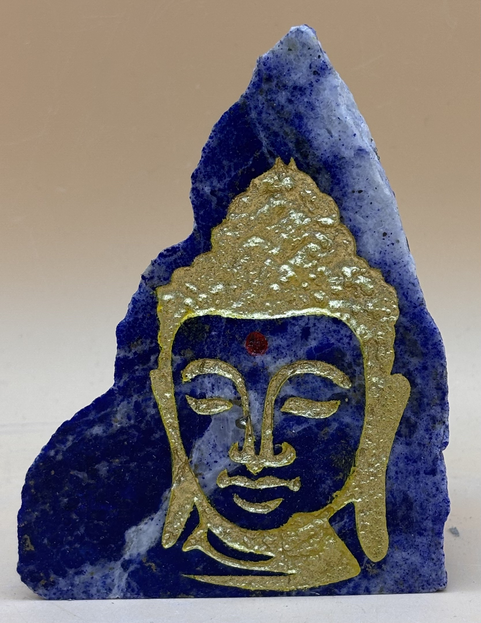 Afghanischer Lapislazuli mit M-vergoldetem Buddha, Oberfläche poliert, Seiten Natur, Handarbeit aus Bayern