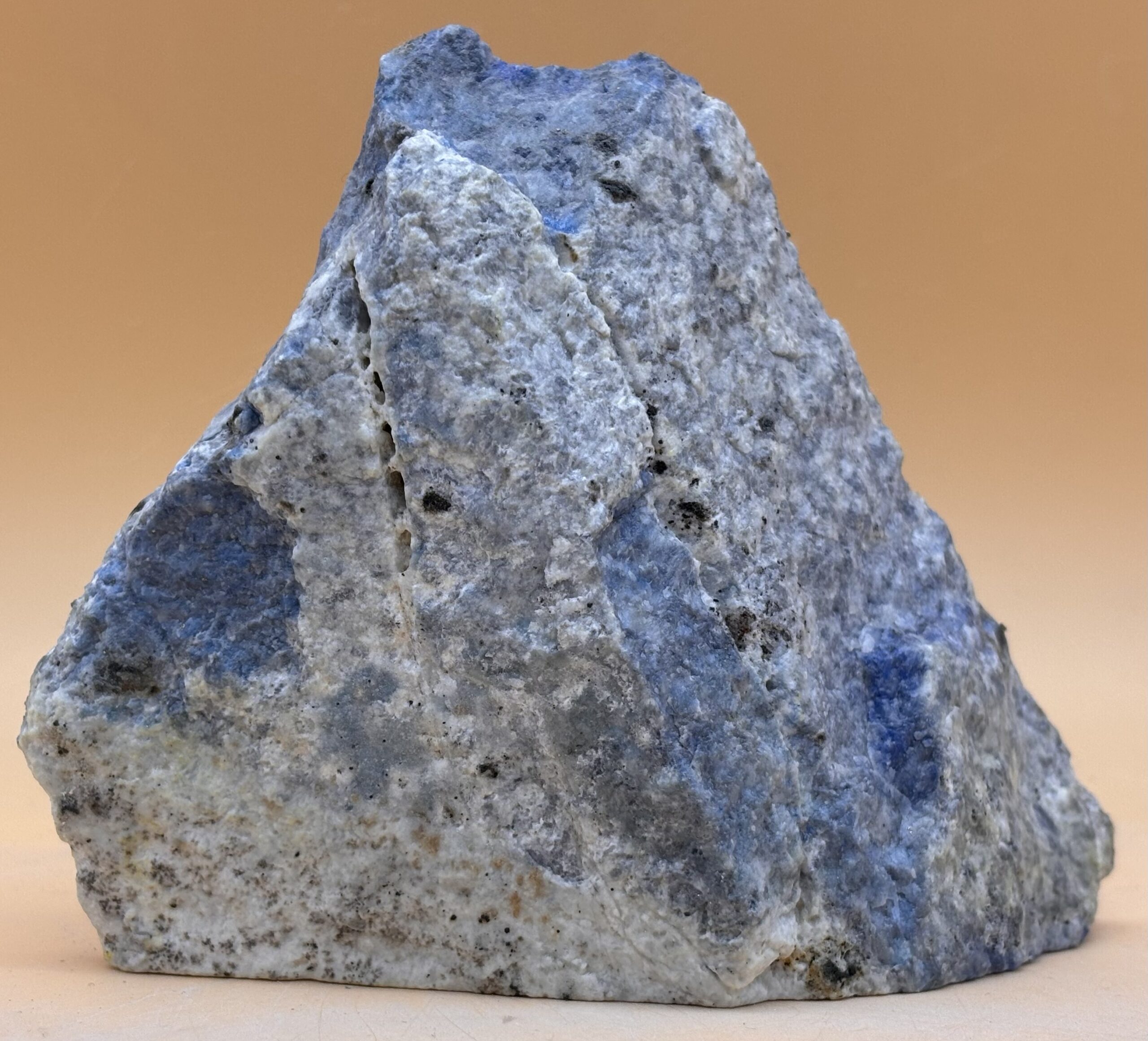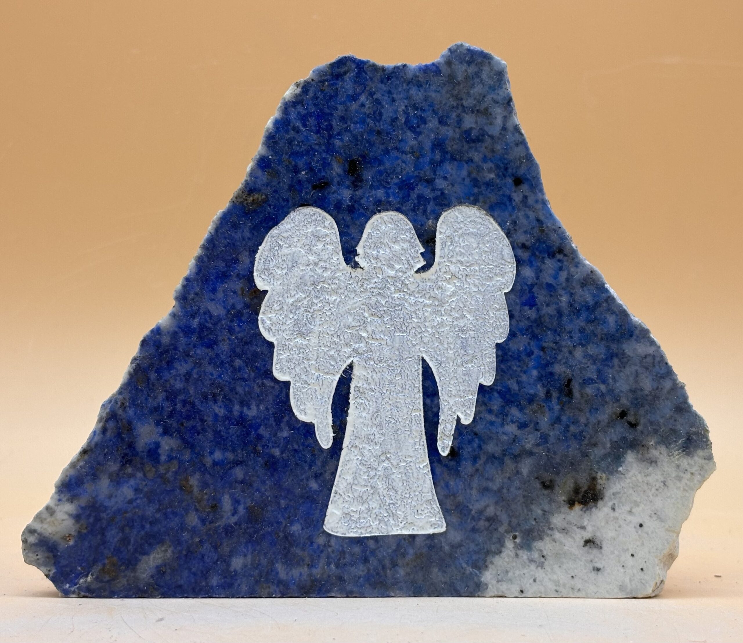 Afghanischer Lapislazuli mit weiß-kolorierter Engel-Gravur, polierte Oberfläche, Rückseite Natur
