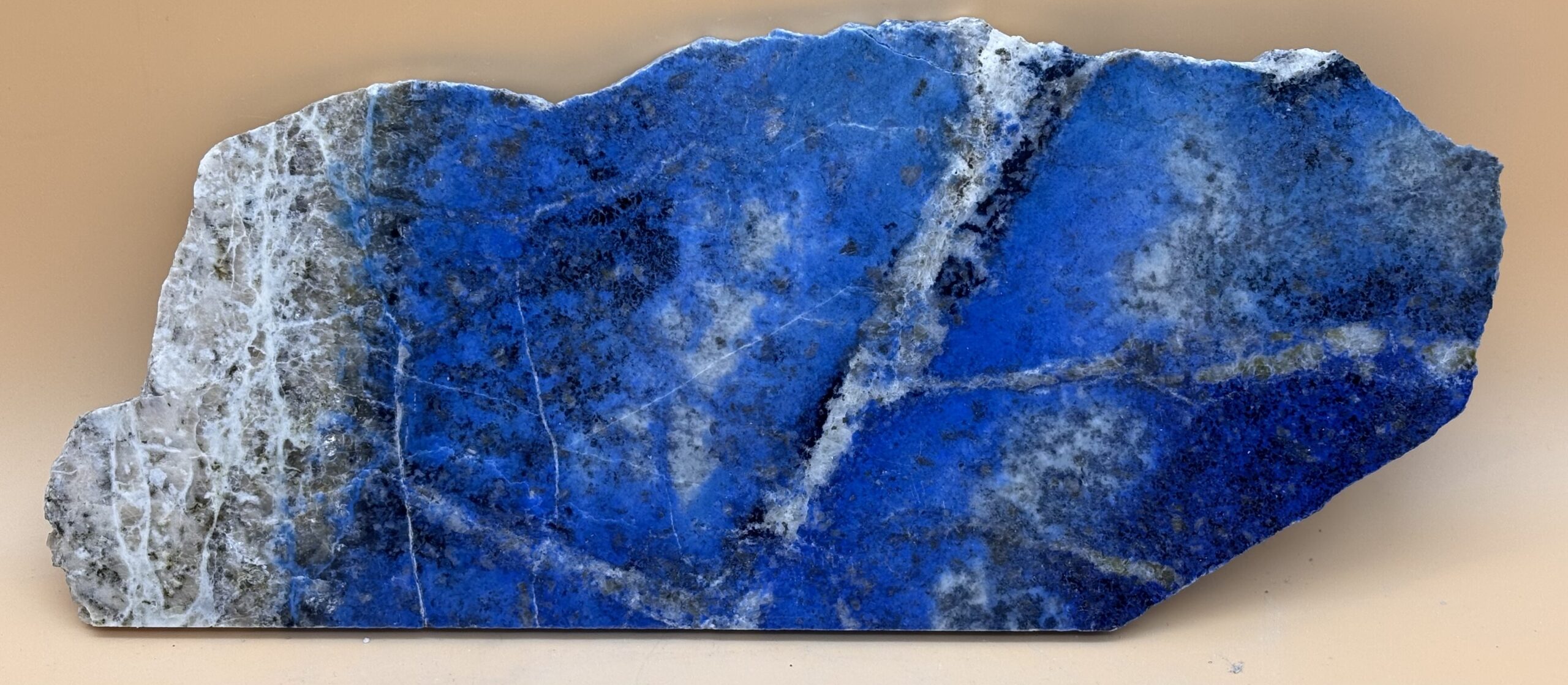 lebhafter Afghanischer Lapislazuli, die bewegte Struktur mit der weißen Aderung aus Calcit gibt dieser blauen Dünnschliff Platte eine Optik wie ein Küstenstreifen der Cote azure. Beidseitig poliert