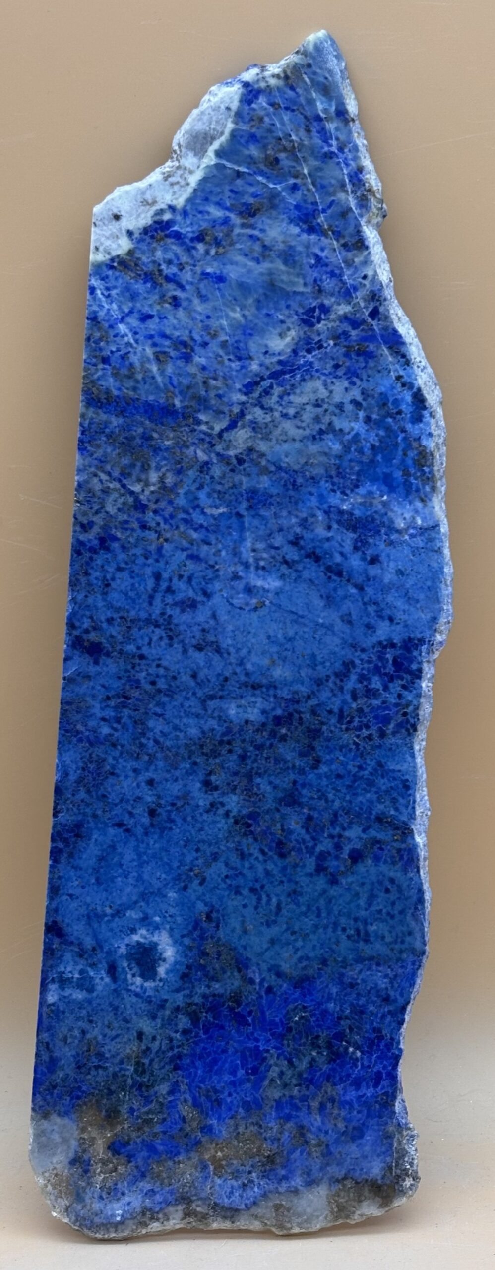 in allen Blautönen erstarrtes hydrothermales Gestein aus den Minen des Afghanischem Hindukusch, sehr dichtes Material, klingt beim Anklopfen. Lapislazuli oder Ultramarin genannt, seit der frühesten Antike eines der begehrtesten Steine für Schmuck und Mosaikarbeiten. Platte beidseitig poliert, Hergestellt im Unterallgäu