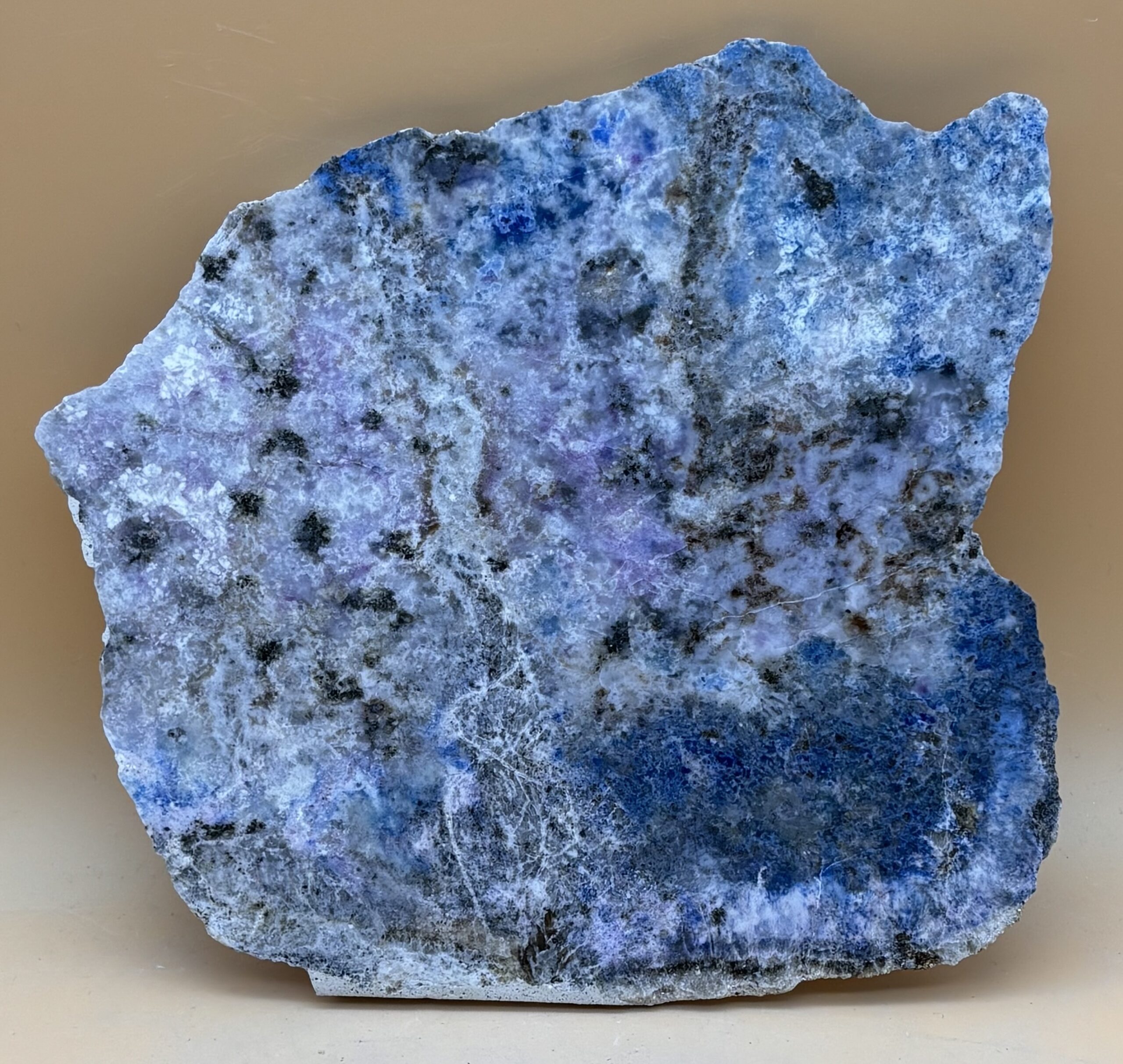 Misch-Gesteins-Platte Lapislazuli mit pinkfarbigen Mineral-Einschluß. Hydrothermale Entstehung, pinkfarbige Einschlüße deuten Mineralogisch auf Sugilith hin. Plattenzuschnitt und Oberflächenbearbeitung Bad Wörishofen Bayern