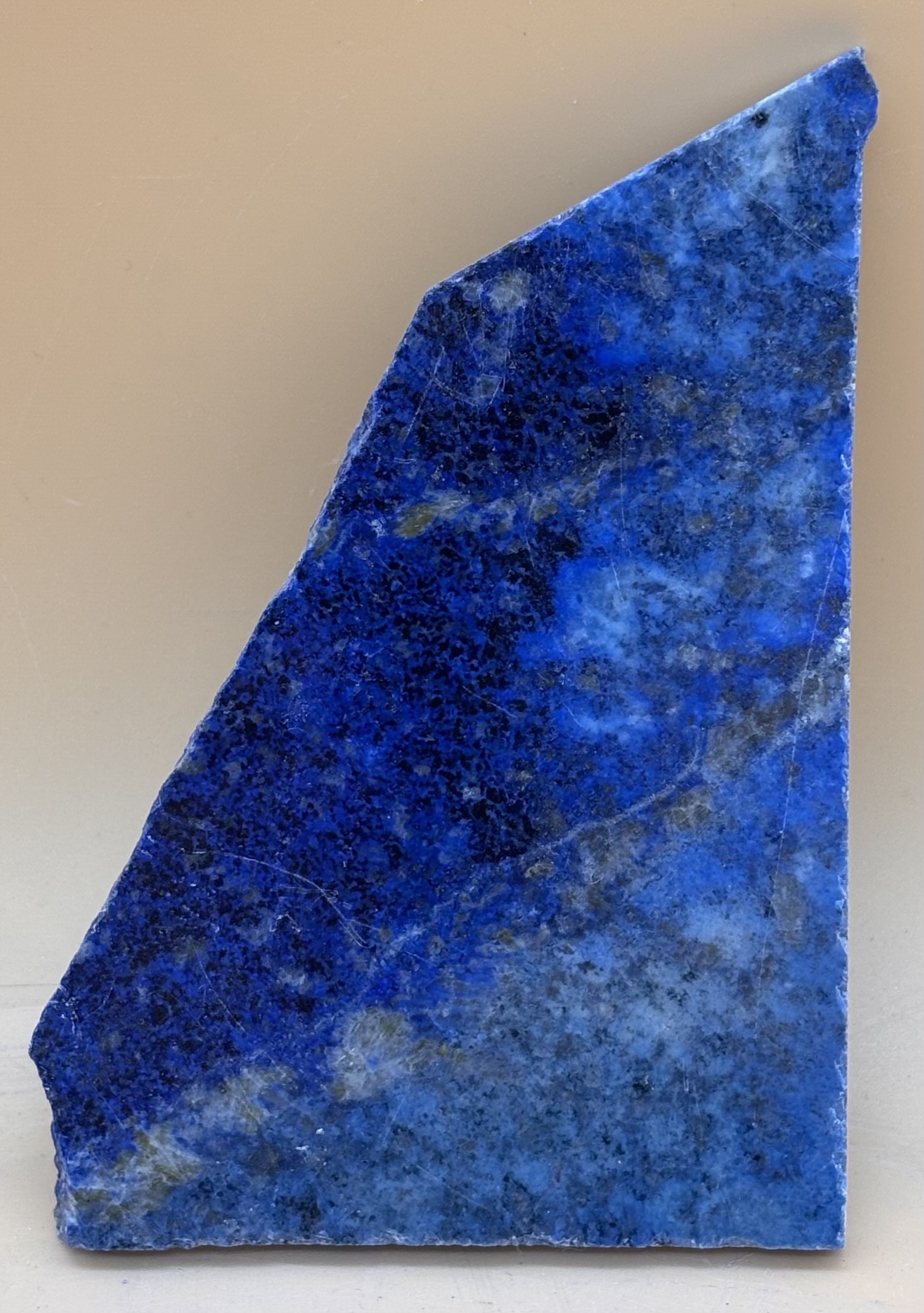 Tiefblau bis Dunkel-Türkis sind die Haupttöne dieser Lapislazuli-Platte, beidseitig poliert