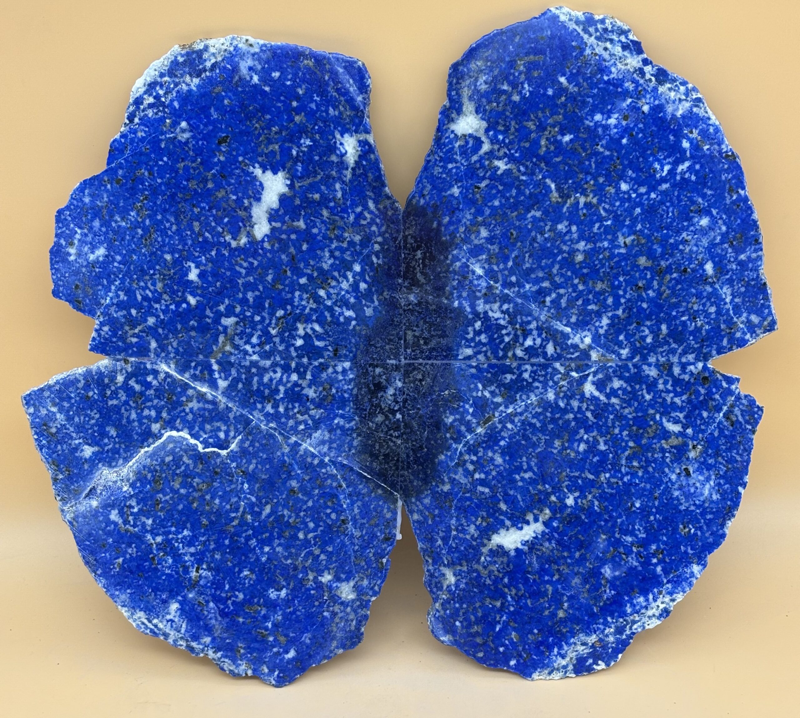 Lapislazuli-Scheibe aus vier Einzelscheiben im Spiegel zusammengesetzt. Oberfläche poliert, Rückseitig Glasfaserverstärkt, Kanten Natur