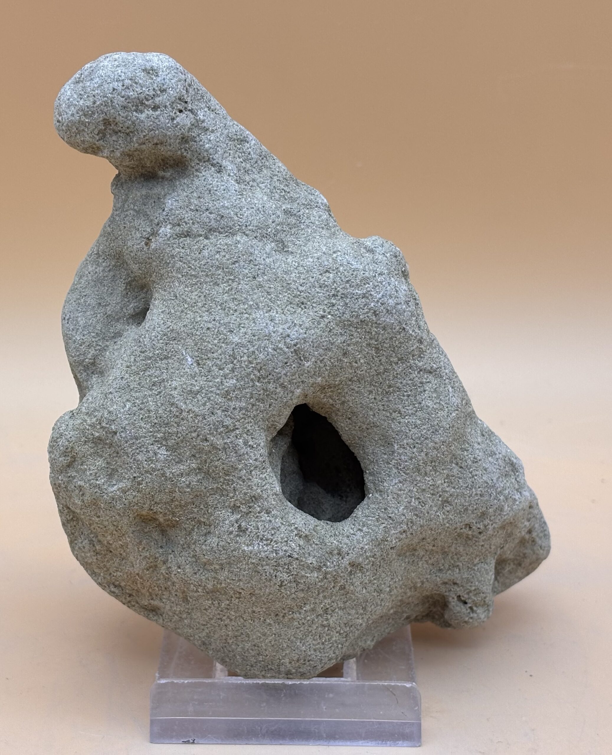 Löss-Kalk-Konkretion aus dem Unterallgäu, auch Lösskindl genannt, entstehen durch Kalkausfällungen in Senken der tonigen Böden. Lösskindl auch darum, weil sie kleinen Figuren oder Tieren ähnlich sehen. Unser abgebildetes Lösskindl sieht mit ein wenig Fantasie einem Schafkopf ähnlich, das Silberauge wurde von uns eingesetzt