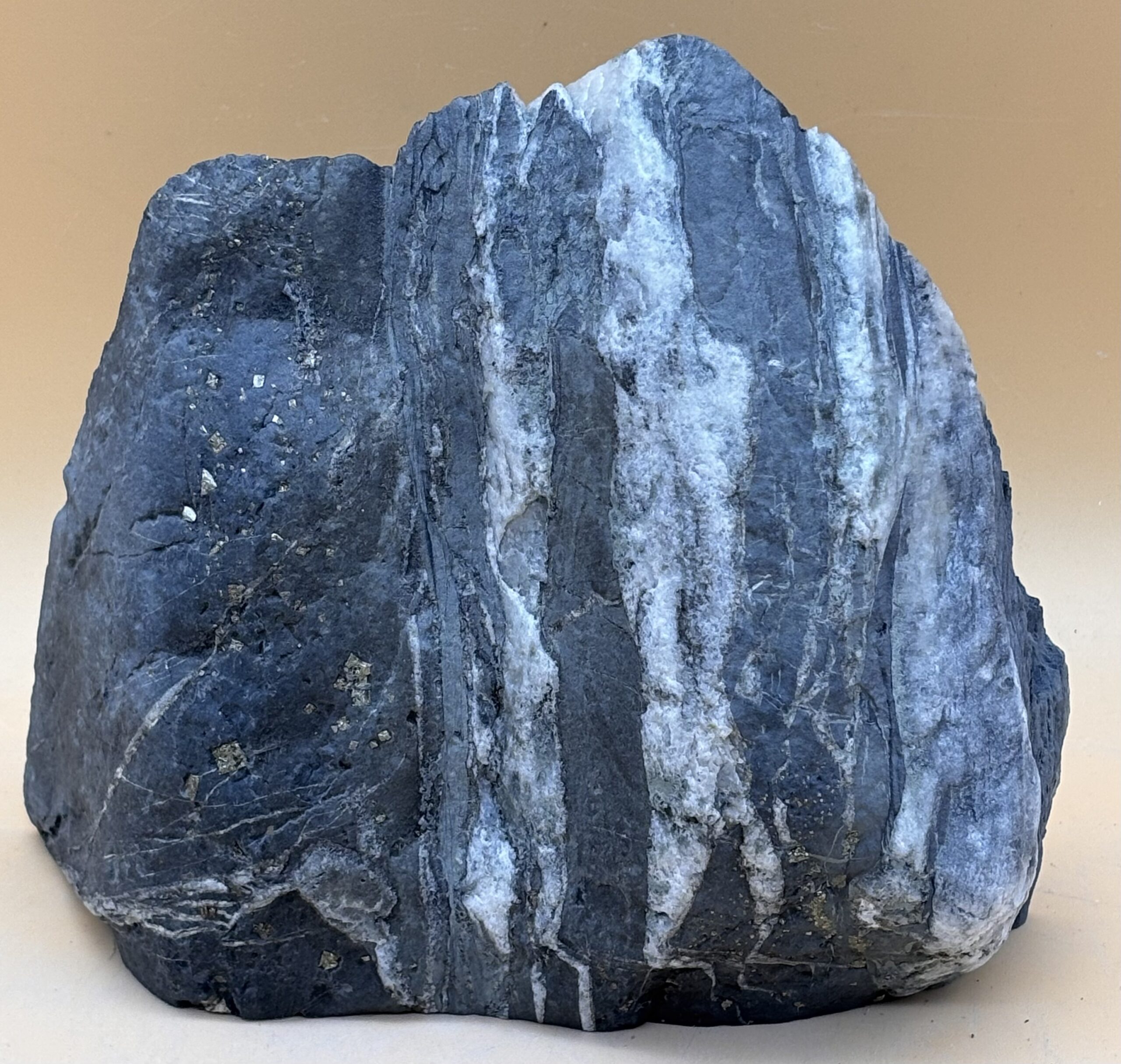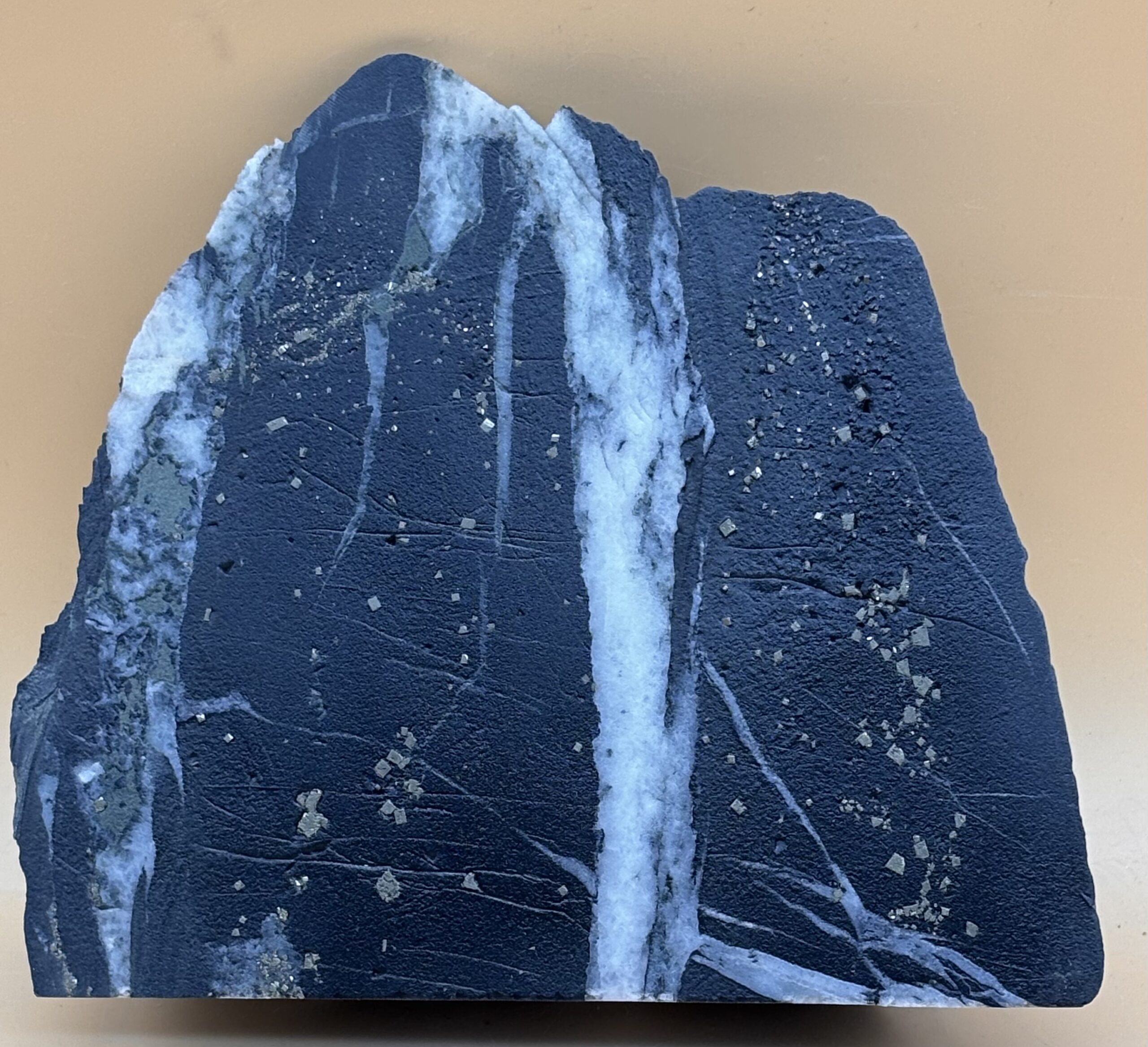 würfelige Pyritkristalle in schwarzer Schiefer-Matrix mit weißer Quarzaderung