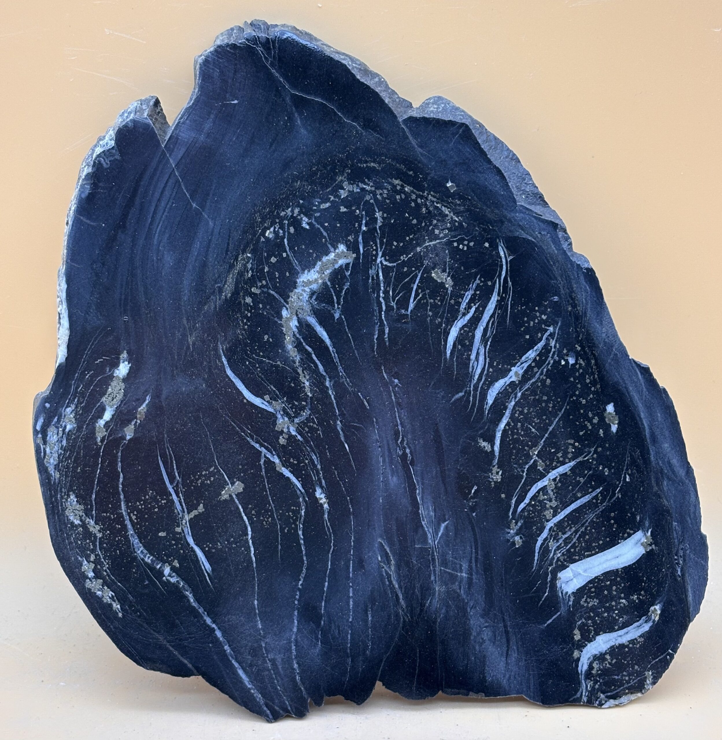 polierte Nolla Pyrit Schiefer Platte mit Strukturverformung , Herkunft: Hinterrhein Graubünden Schweiz