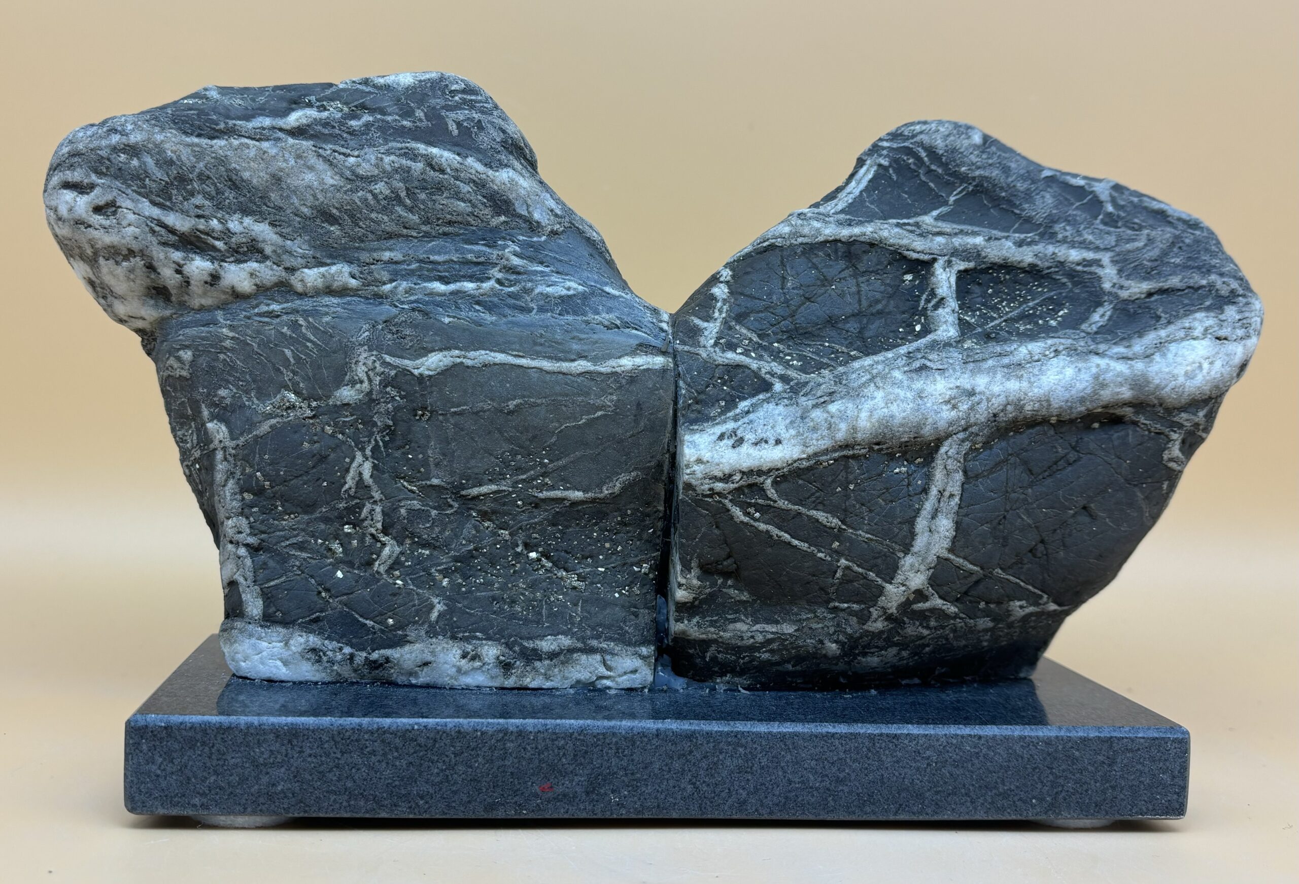 Nollaschiefer- Spiegel mit Dolomit-Marmorengel auf antrazit-farbenen Diorit-Basis-Sockel. Fein verteilter goldig glänzender Pyrit in einer mit hellen Quarzadern durchzogenen antrazit-farbenen Matrix. Davor reckt sich ein weißer, aus Dolomitmarmor gefertigter Engel empor. Hergestellt mit Respekt vor der Natur in Bad Wörishofen / Bayern