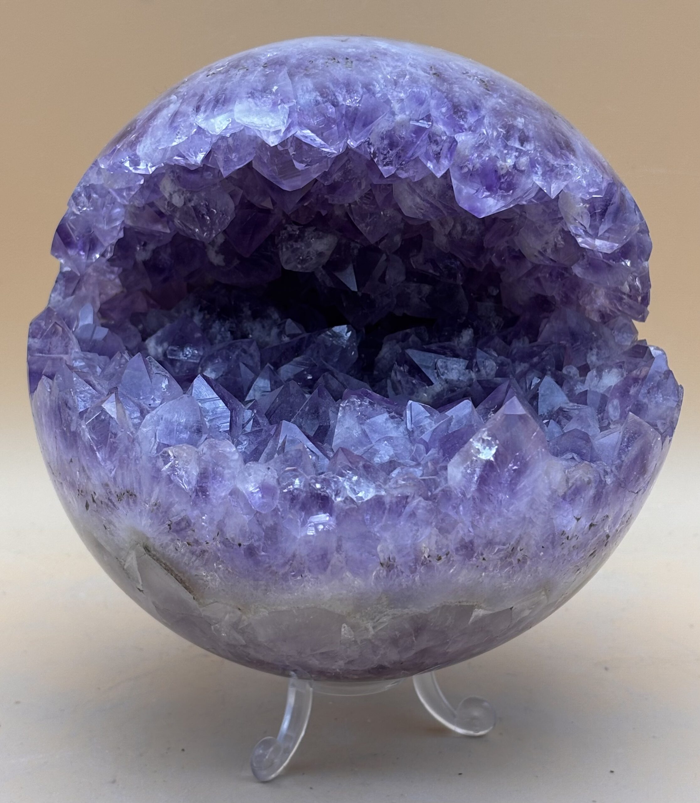 offene Kristall-Drusenkugel aus Amethyst, Kugel-Oberfläche poliert