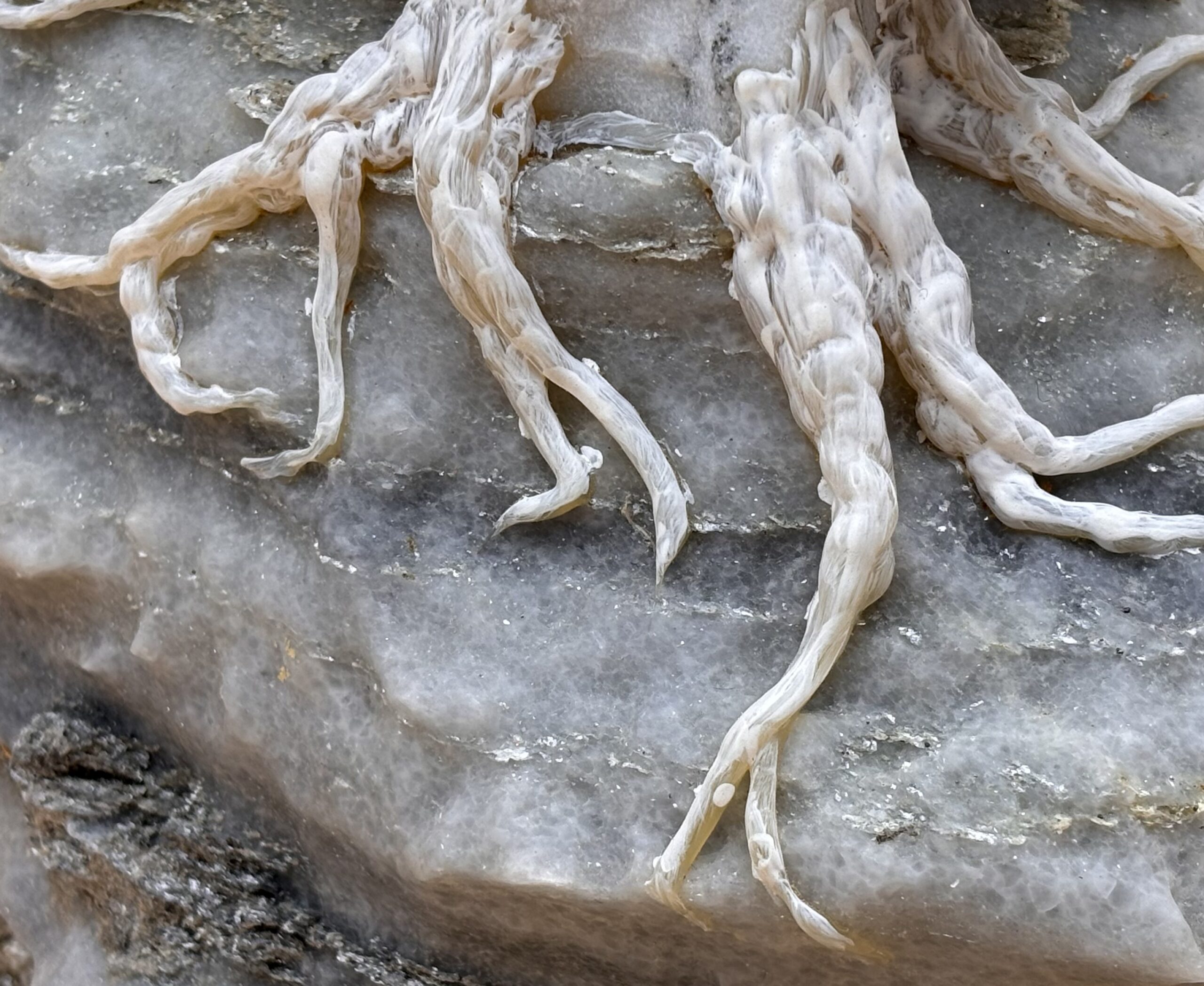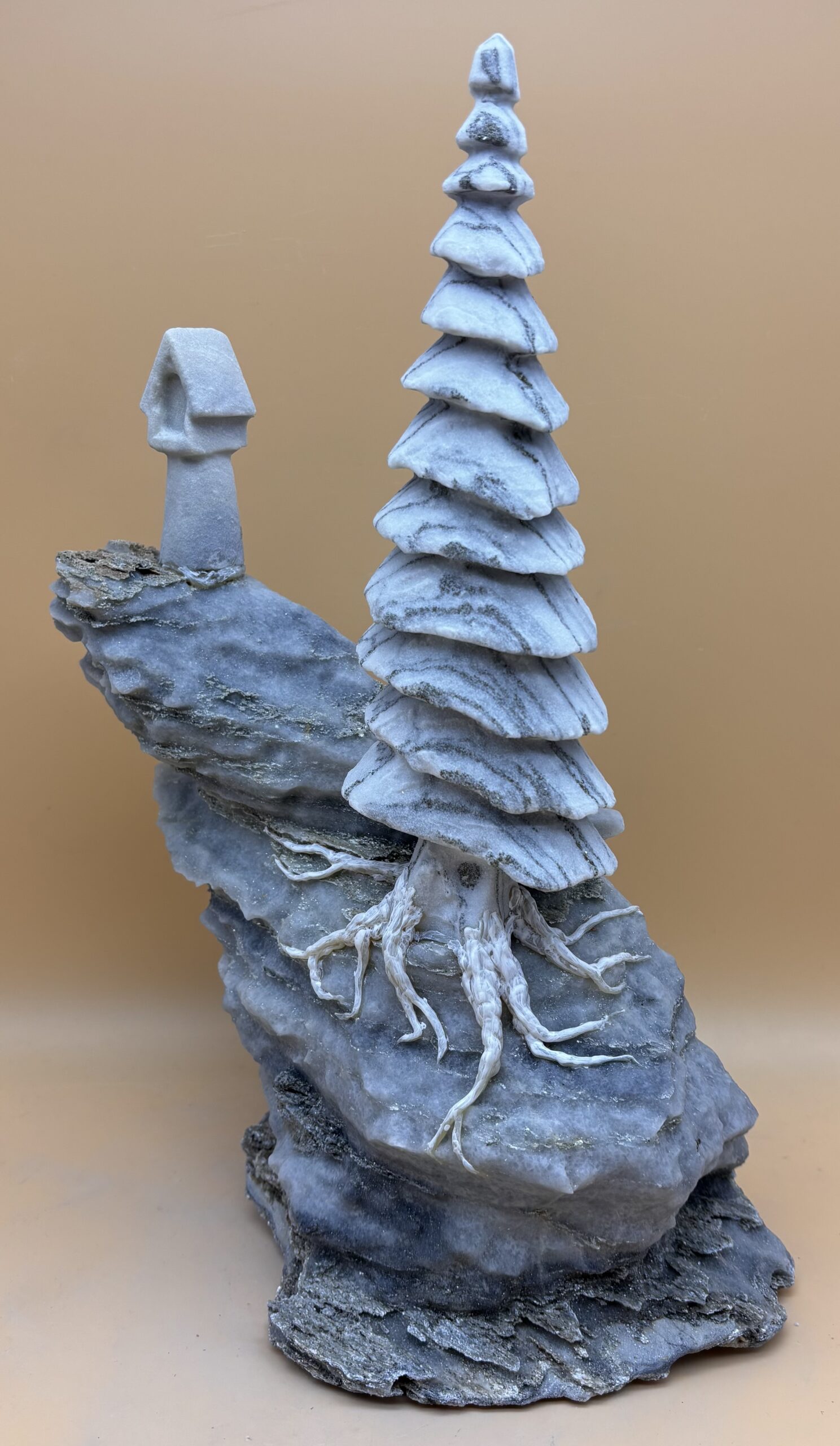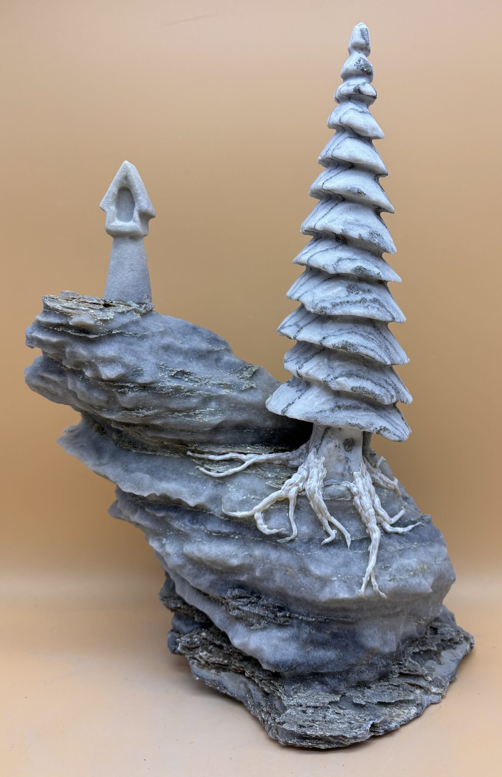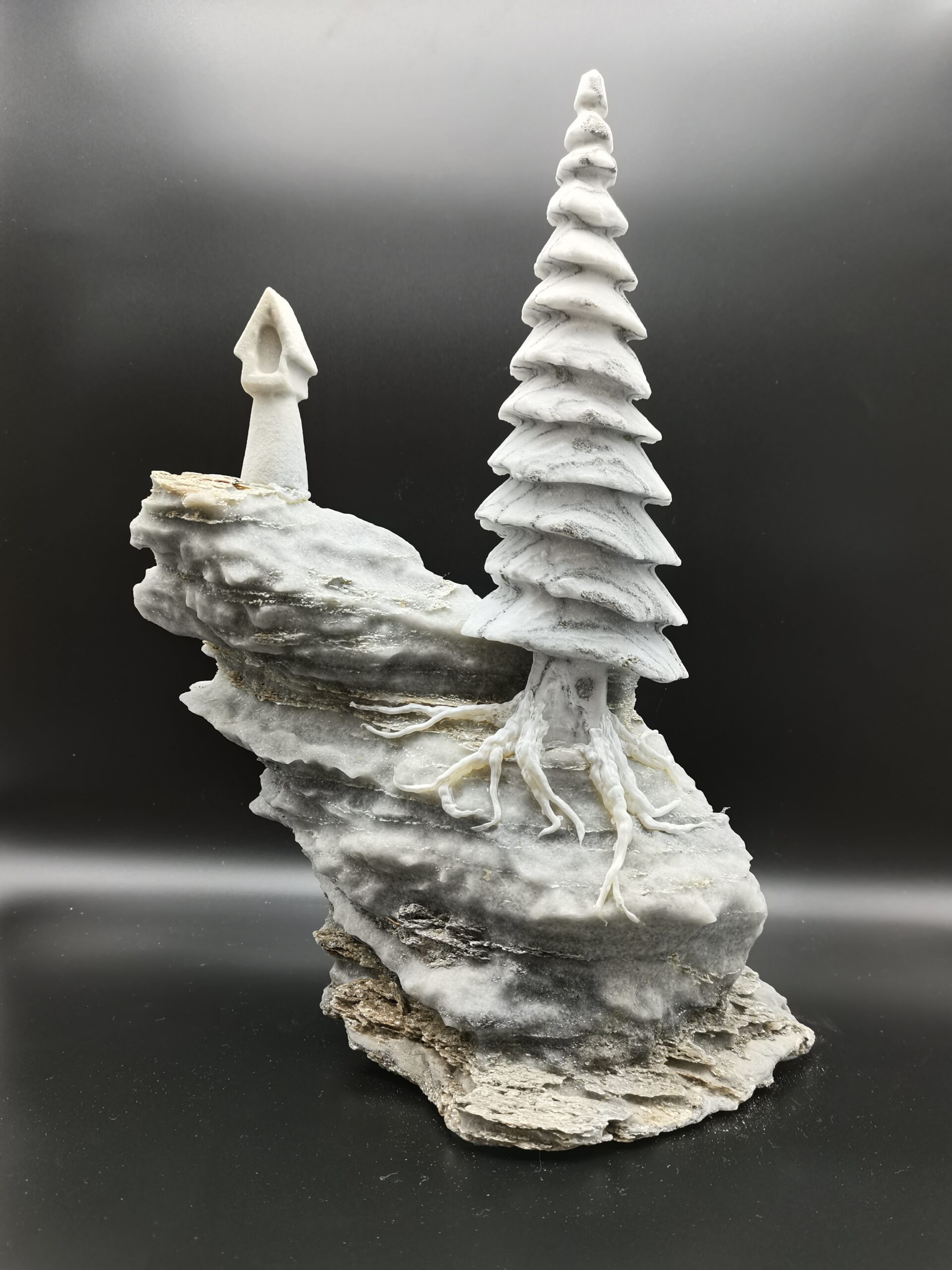 ein Zufluchtsort des Bewustsein. Walliser Goldmarmor auf Schwarzenbach Dolomitmarmor, vom Gletscherbach geformt, aus Meisterhand vollendet. Steinbildhauer Peter Fraefel