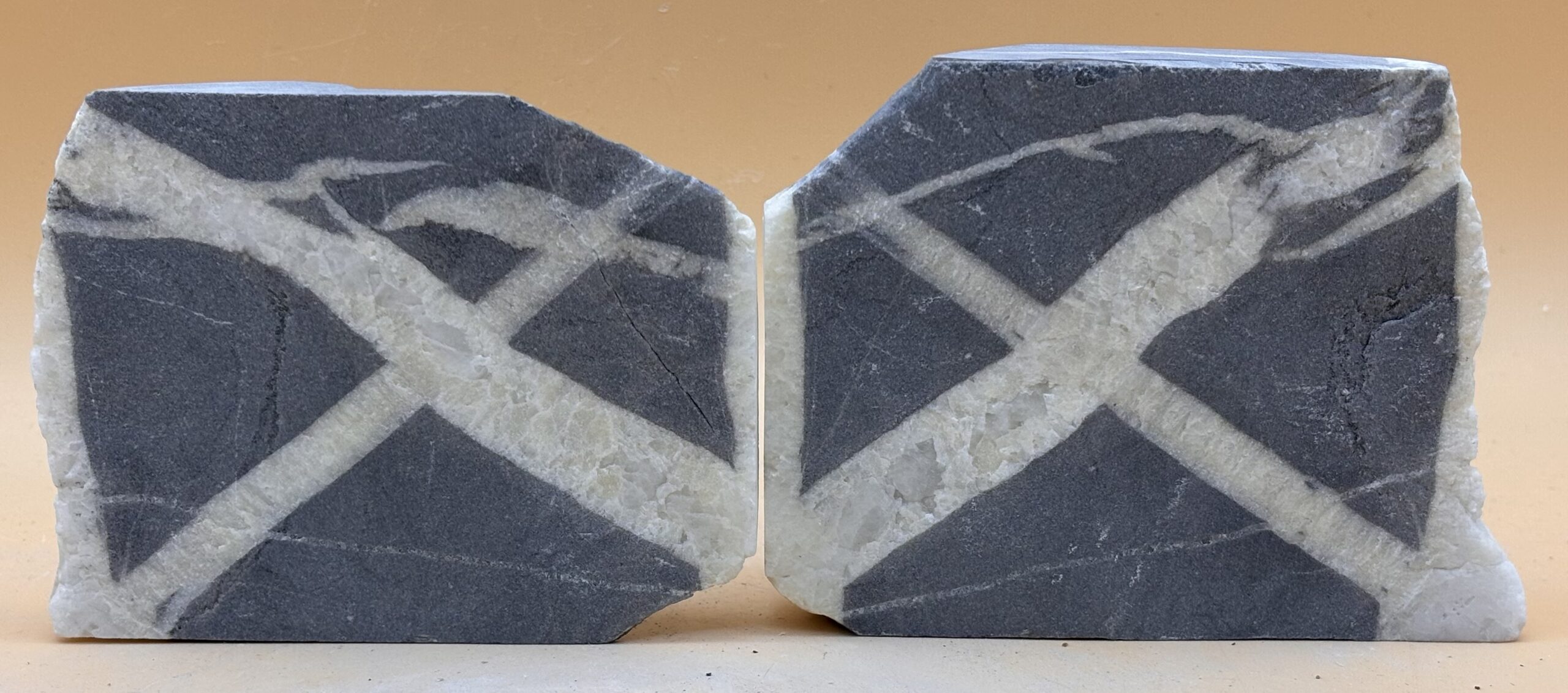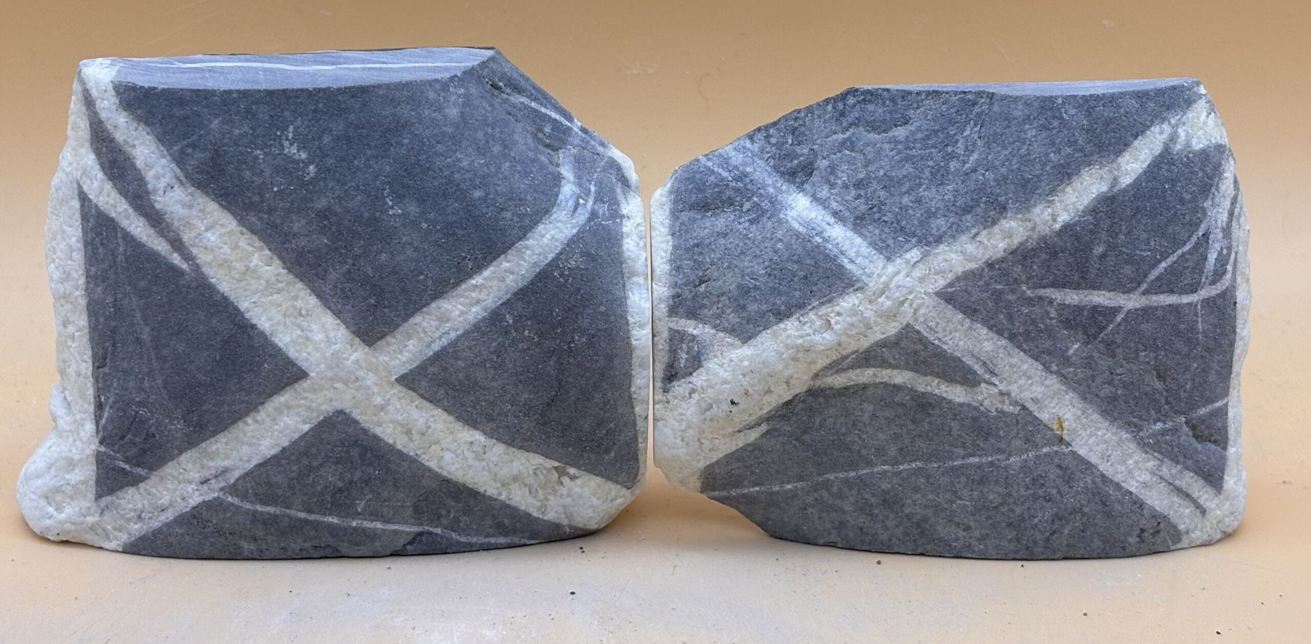 mittig geteilter Rheingoldschiefer Stein mit X Zeichnung, optimal für das Kunsthandwerk, Schnittfläche jetgestrahlt, Herkunft : Hinterrhein Graubünden Schweiz