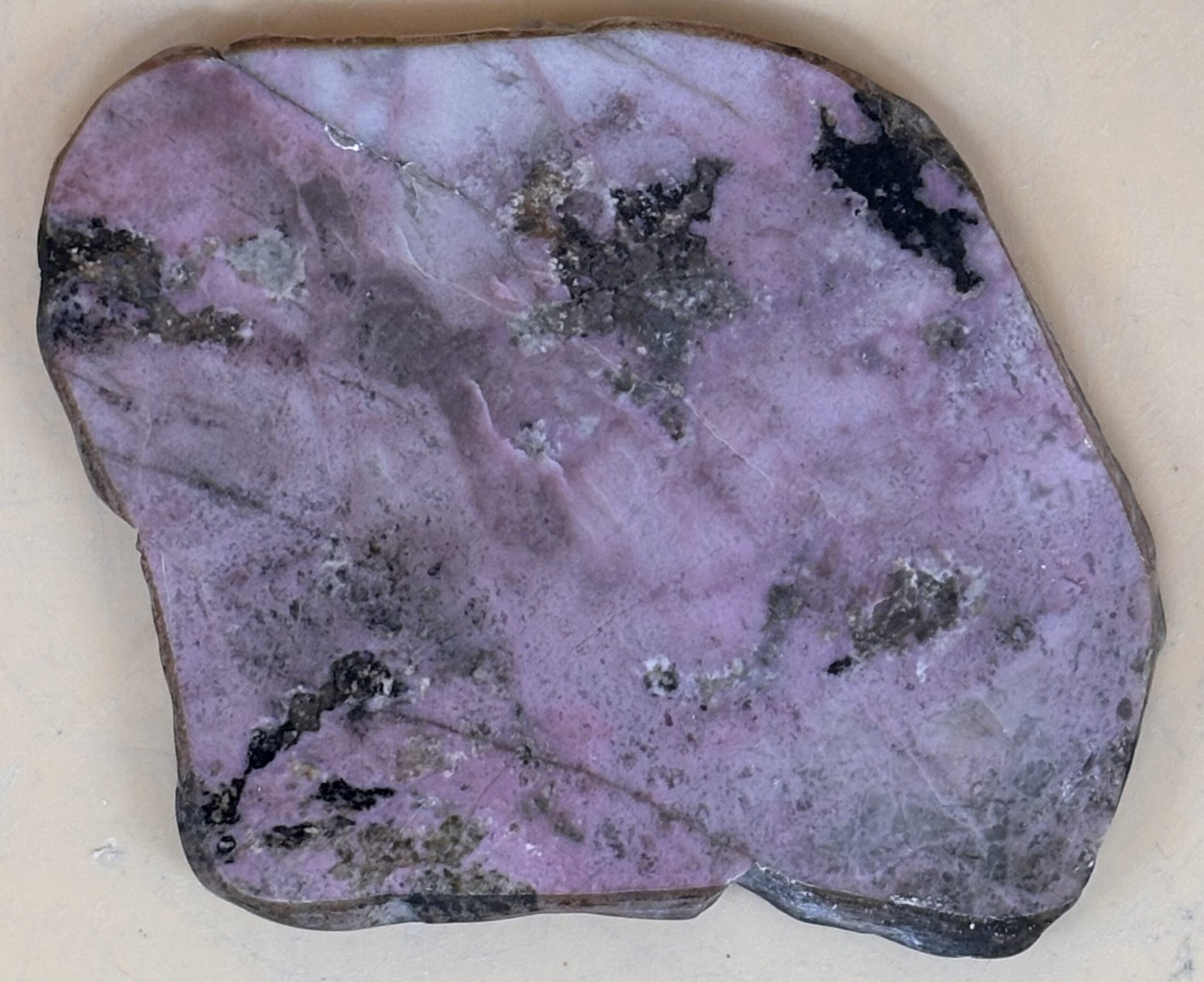 Australischer Rhodonit vom Mt. Hay Queensland. Ein geschultes Auge findet in diesem weitläufigen Gebiet nicht nur Thundereggs, sonden auch seltene Rhodonite. Scheibe poliert