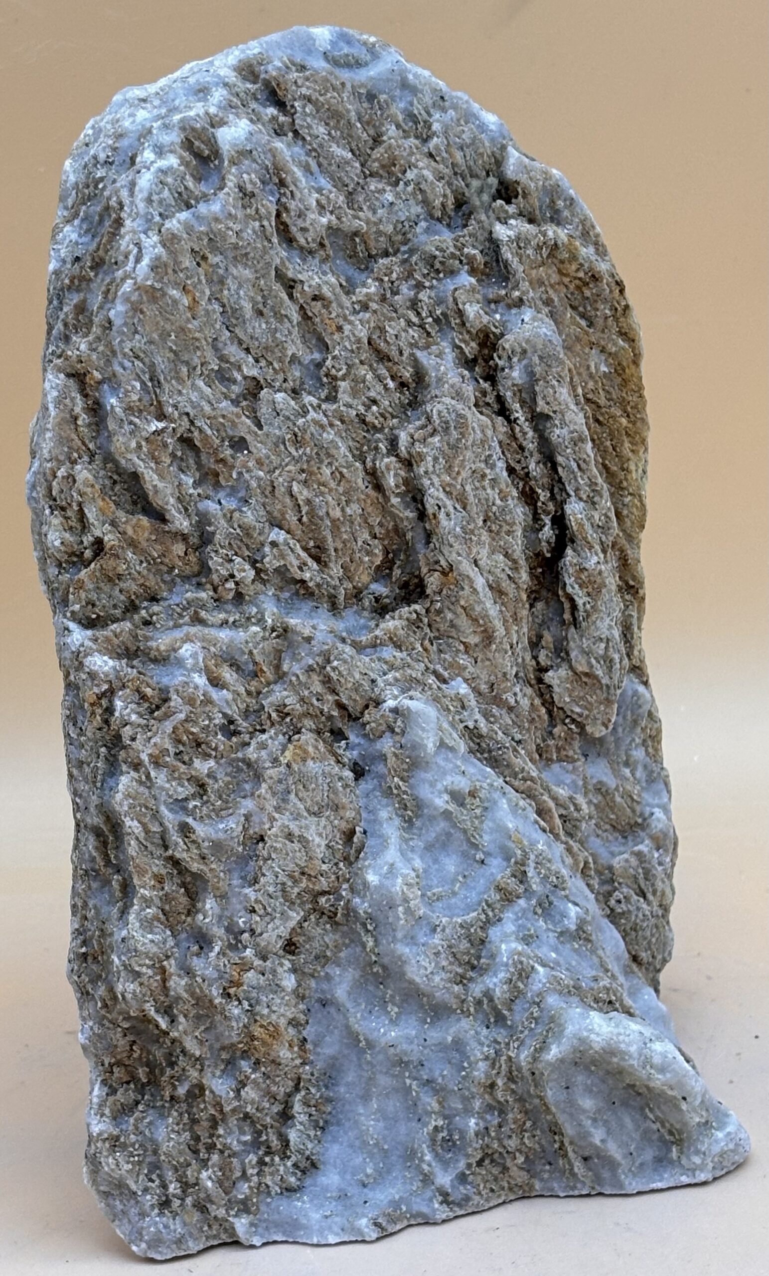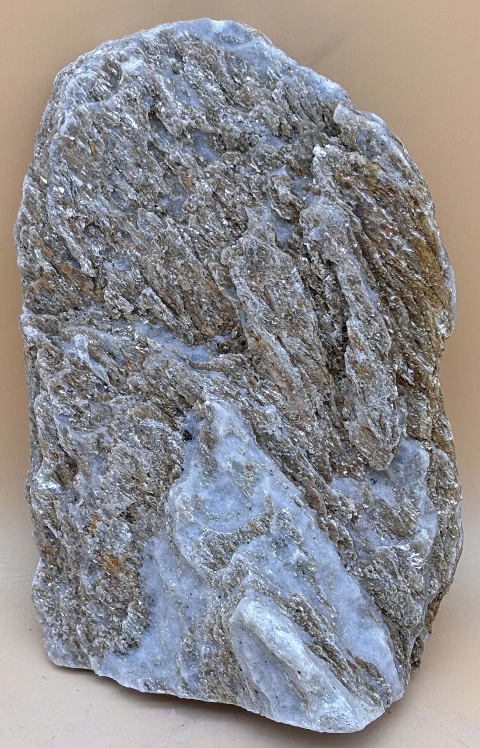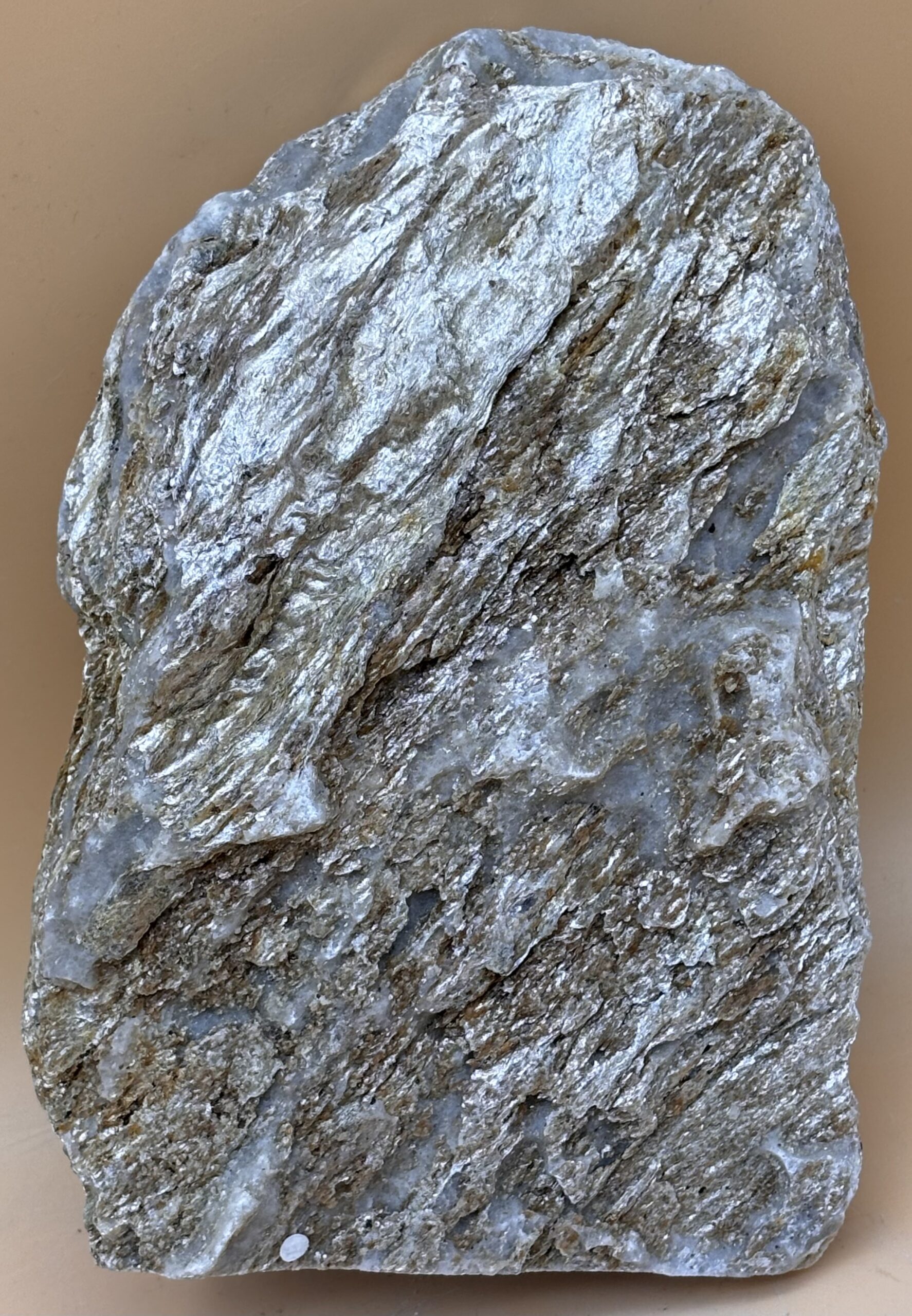 Walliser Schwarzenbach Dolomit ist einer Glimmerreichsten seiner Mineral-Gruppe. Glasig metamorpher Dolomit mit bronzefarbenen Muskovit Schichtungen, die selbst an der Fundstelle, unter einem Wasserfall eines Gletscherbach nicht so stark ausgewaschen wurden wie das des Dolomit. Je nach Lichteinstrahlung, ein wahres Wunderwerk der Erosion. Standfläche gesägt