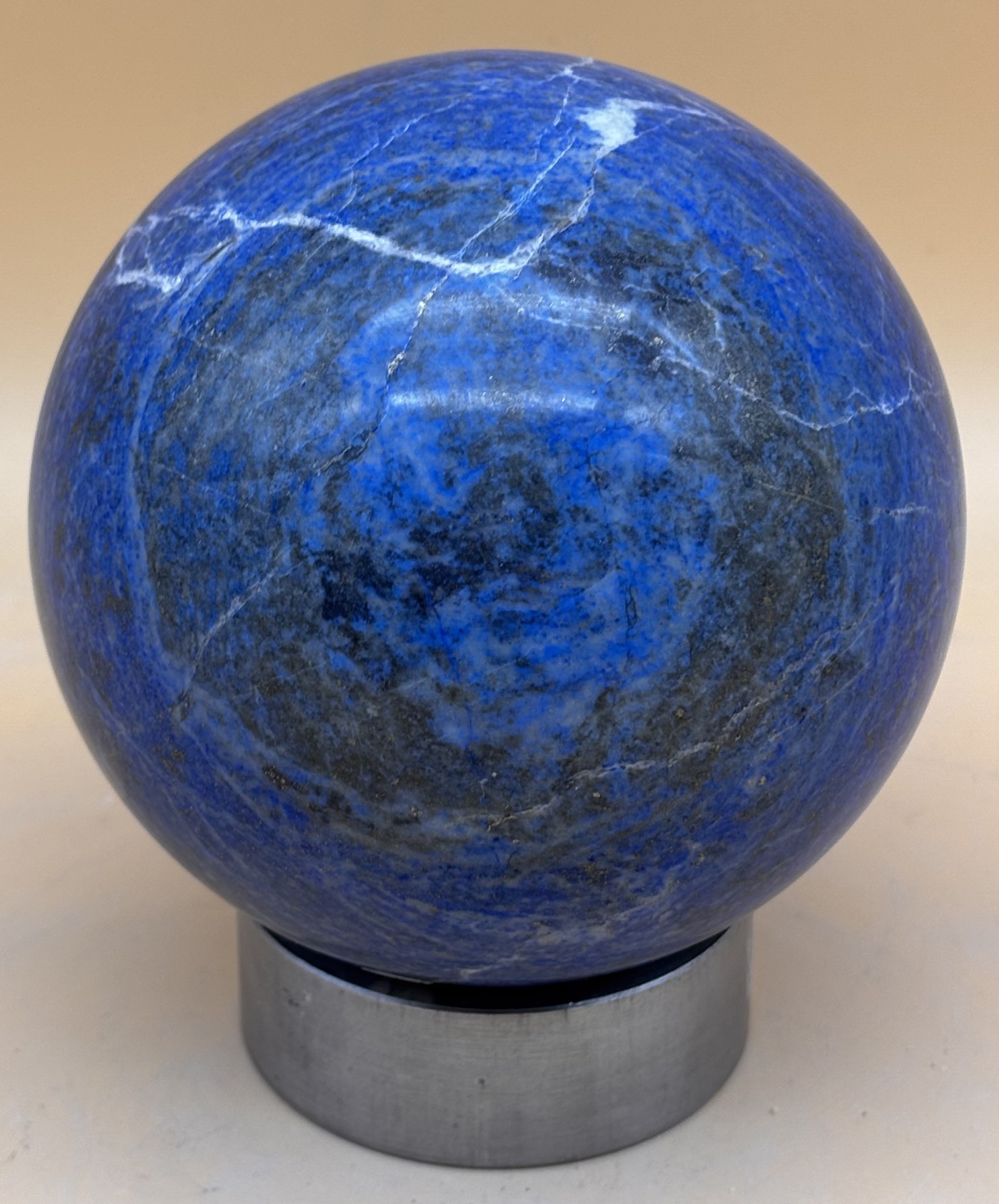 fein gestreifte, mit weißer Quarzaderung durchzogene Königsblaue Lapislazuli Kugel. Oberfläche poliert. Hergestellt in Bayern