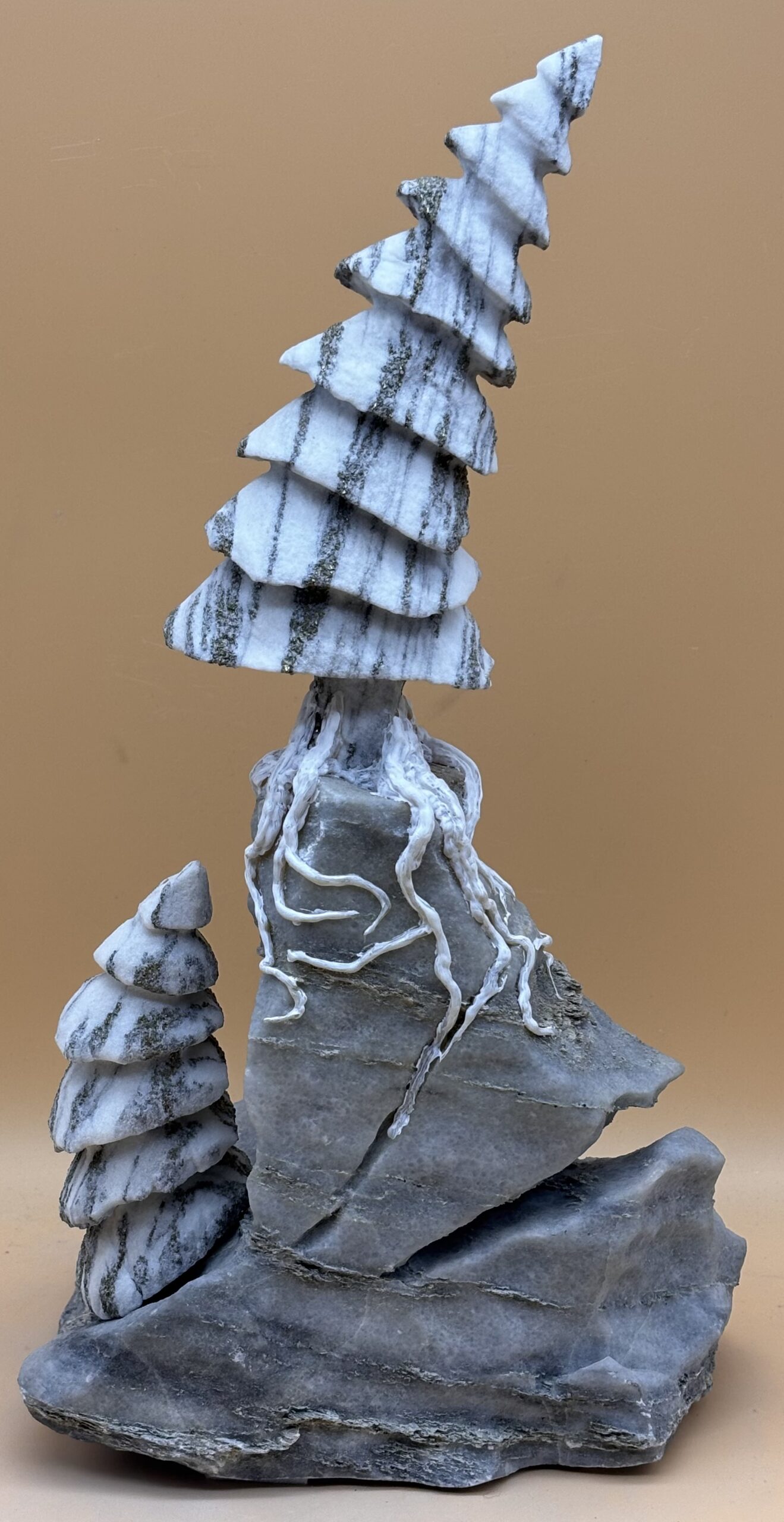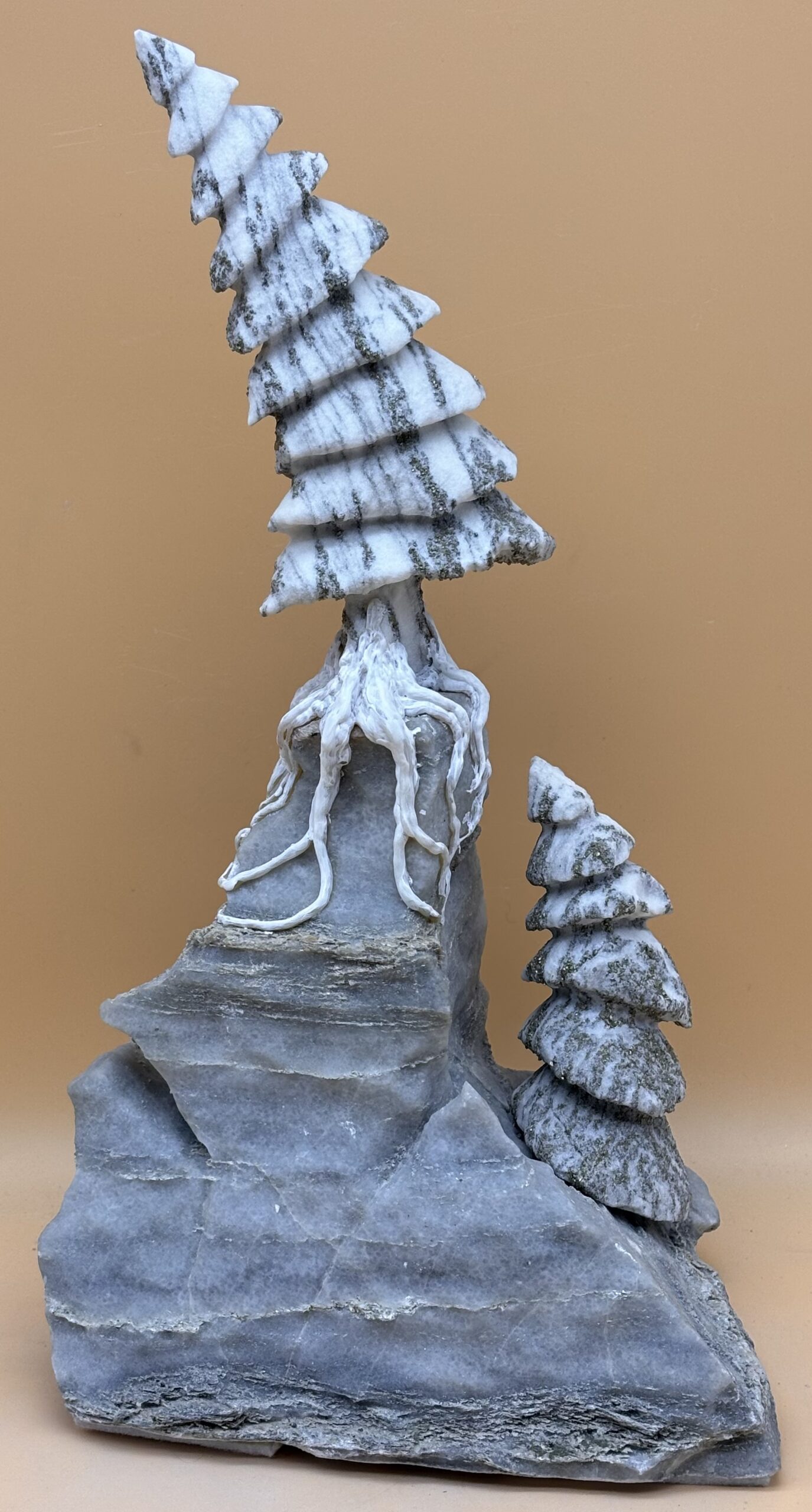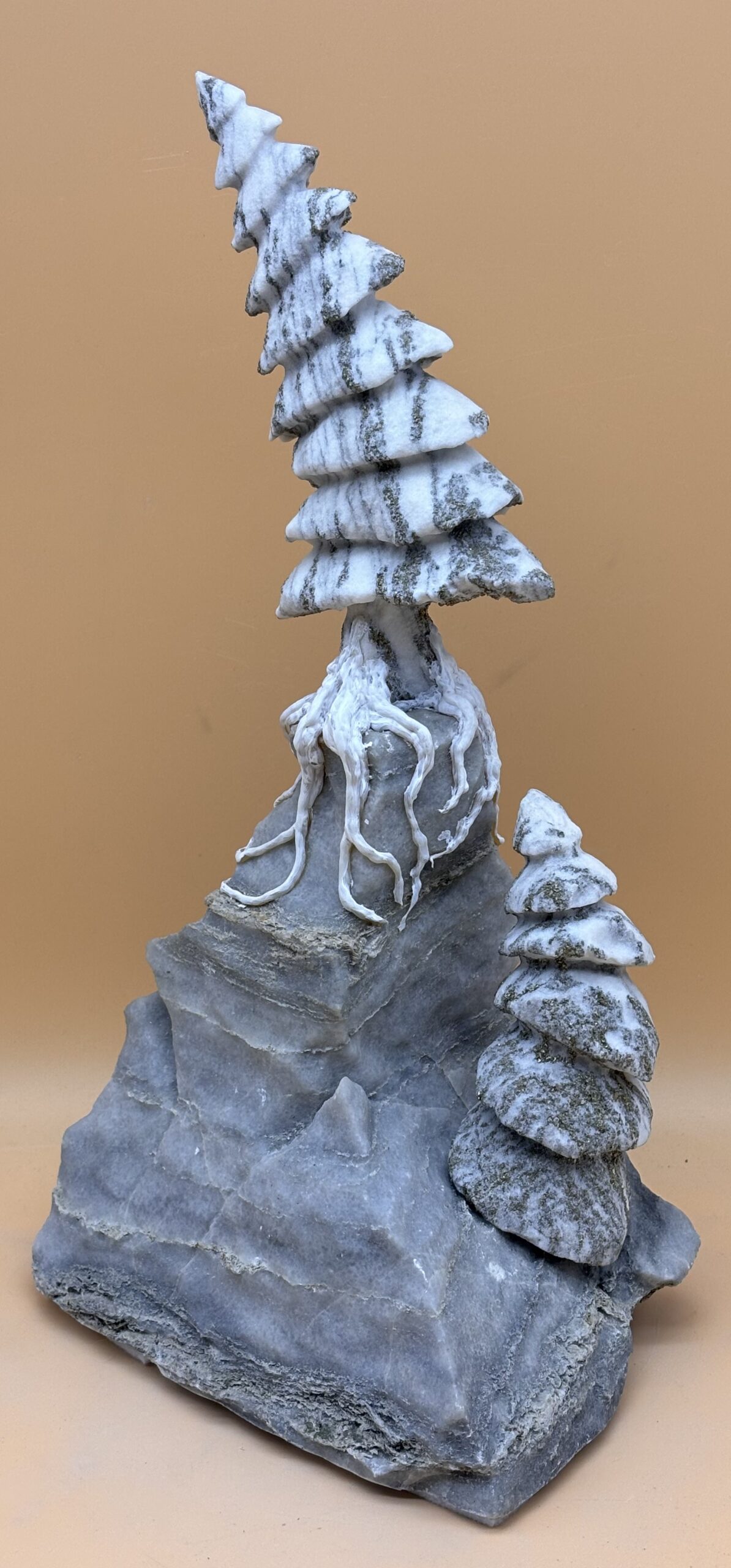 Der Wind bläst in die Wipfel der Bäume am Berg, Wurzeln halten den widrigsten Bedingungen stand. Walliser Goldmarmor auf Schwarzenbach Dolomitmarmor. Bildhauer Peter Fraefel
