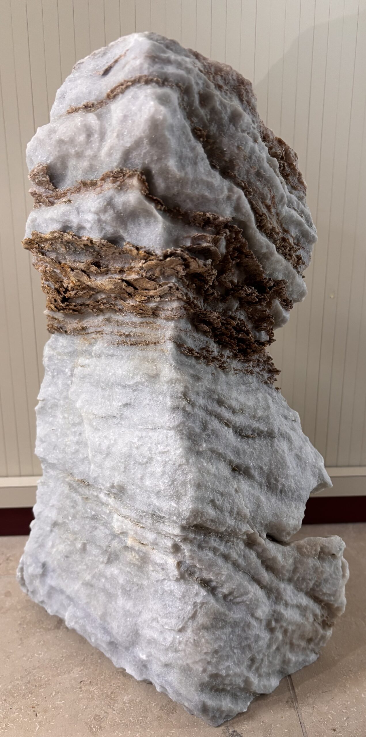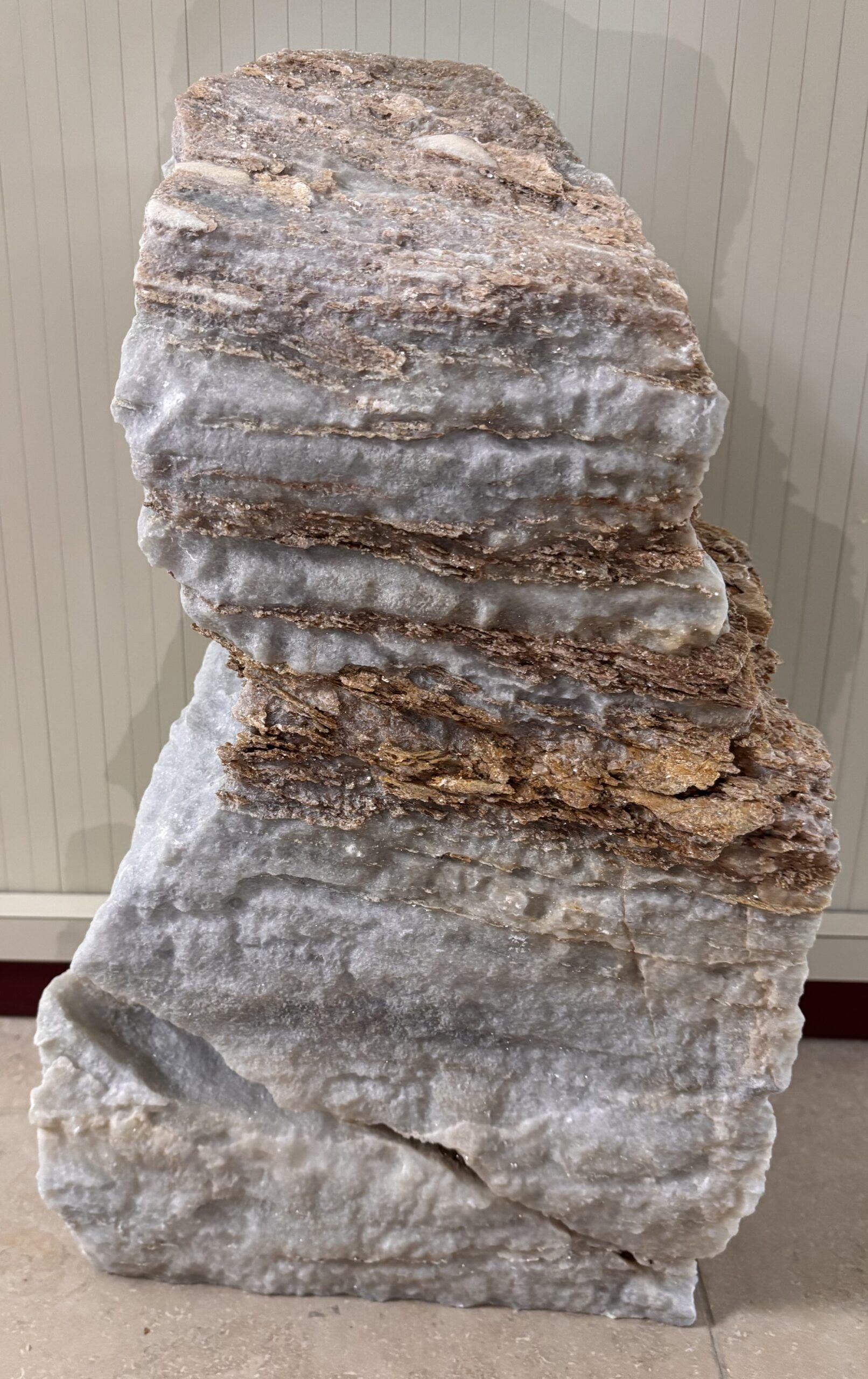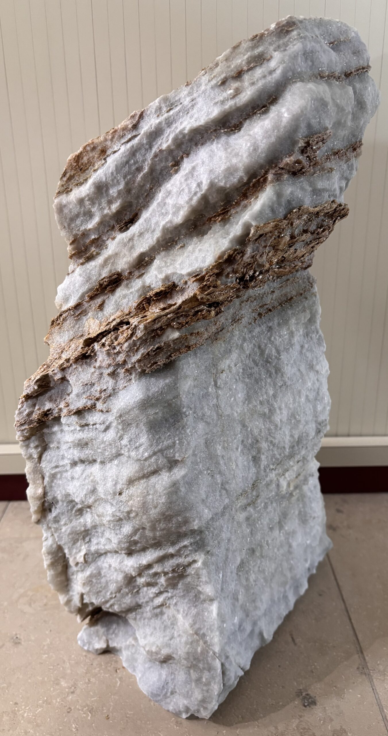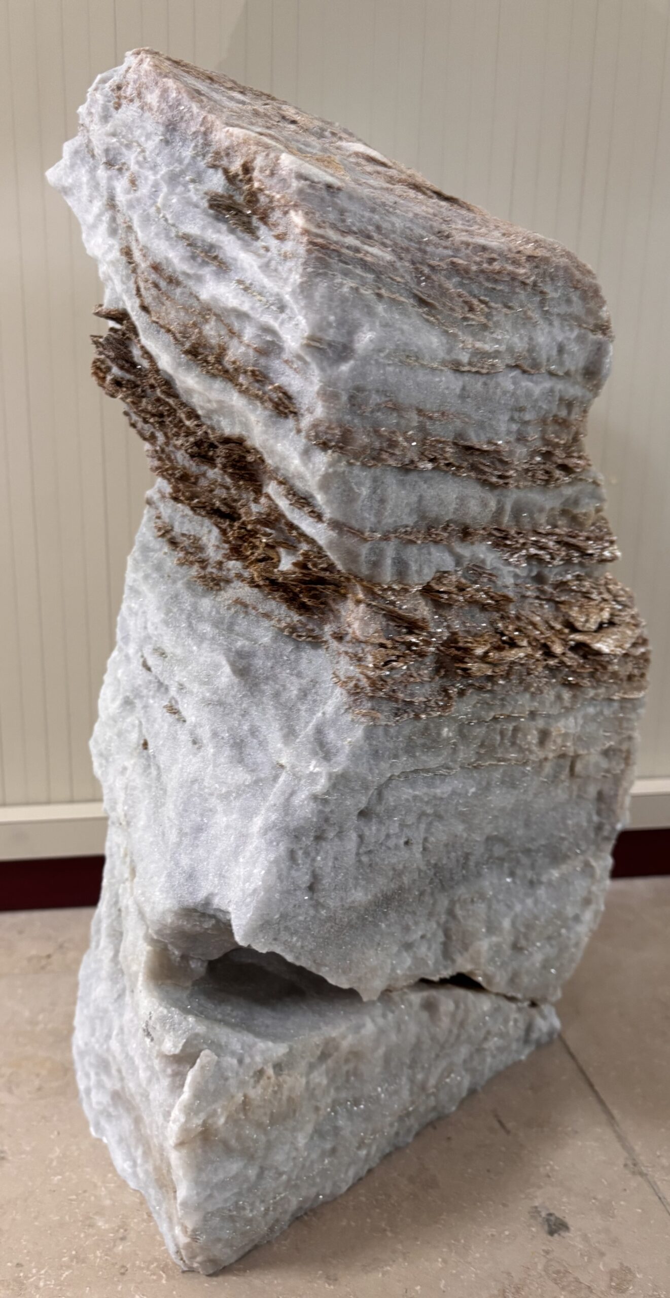 großer Suiseki, eine von tobendem Wasser bearbeitete Felsnadel an steiler Küste. So wirkt dieser von Walliser Gletscherwasser gefomte Dolomitmarmor ( Schwarzenbach Dolomit ). Auf über 1800 Meter wurde dieses Einzelstück dem tobendem Wasser entnommen. Ein weiteres Jahr hätte dieser funkelnde Stein dem extrem Wetter mit Schneeschmelze, Lawinen, Muren und Hochwasser im Bachbett nicht widerstanden. Durch Wasser Erosion hervorgehobener bronzefarbener Muskovit und funkelndem Dolomitmarmor ,was der Optik einen Zugewinn verschafft. Eigenfund