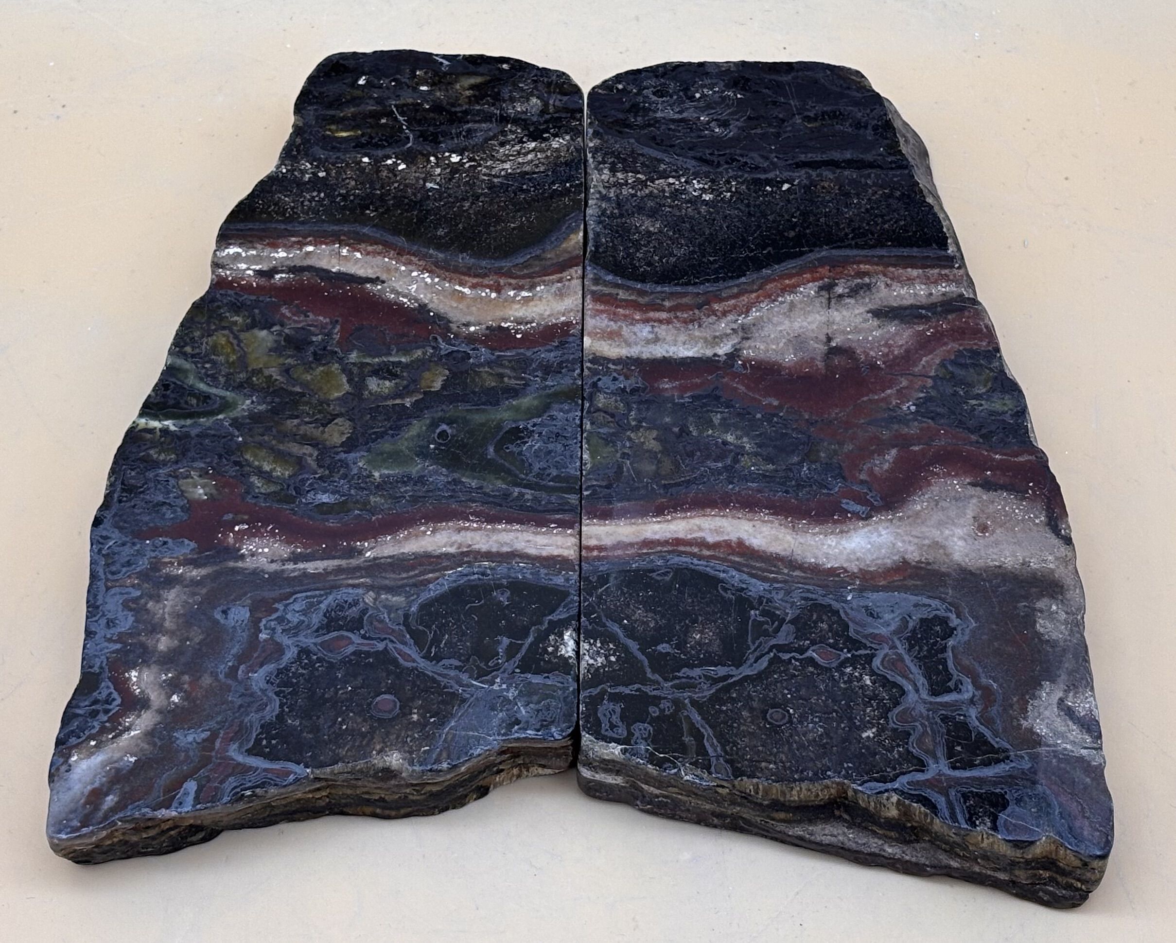 Tigereisen Platten im Spiegel geschnitten und poliert. Fundort : Rohstein, Kings Canyon Westaustralien, schönes Paar für die Vitrine