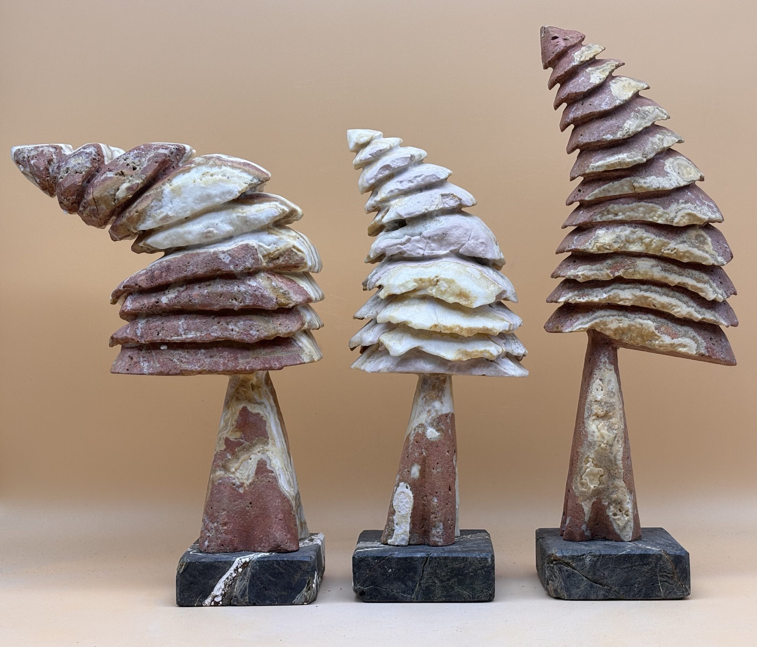 alles biegt sich wenns wieder mal bläst und schneit. Trio Invernale , eine Momentaufnahme. Roter Travertin auf grünem Serpentinit. Bildhauer Peter Fraefel