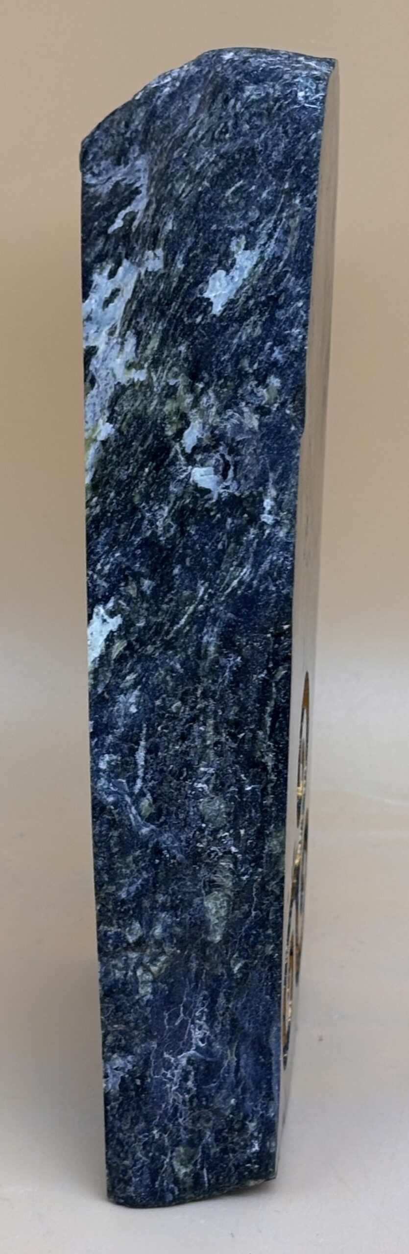 Walliser Serpentin mit Kupfer-farbener Keltischer Triskele, in Handarbeit eingearbeitet, Oberfläche poliert, Rückseite geschliffen, Seiten Natur, Schweizer Handarbeit