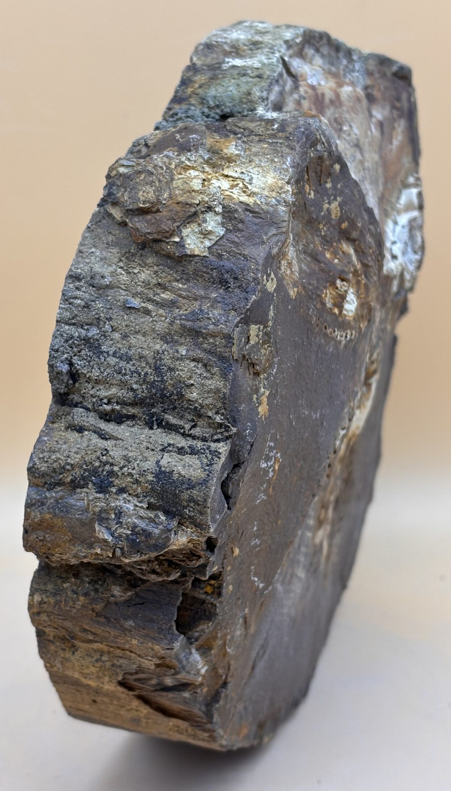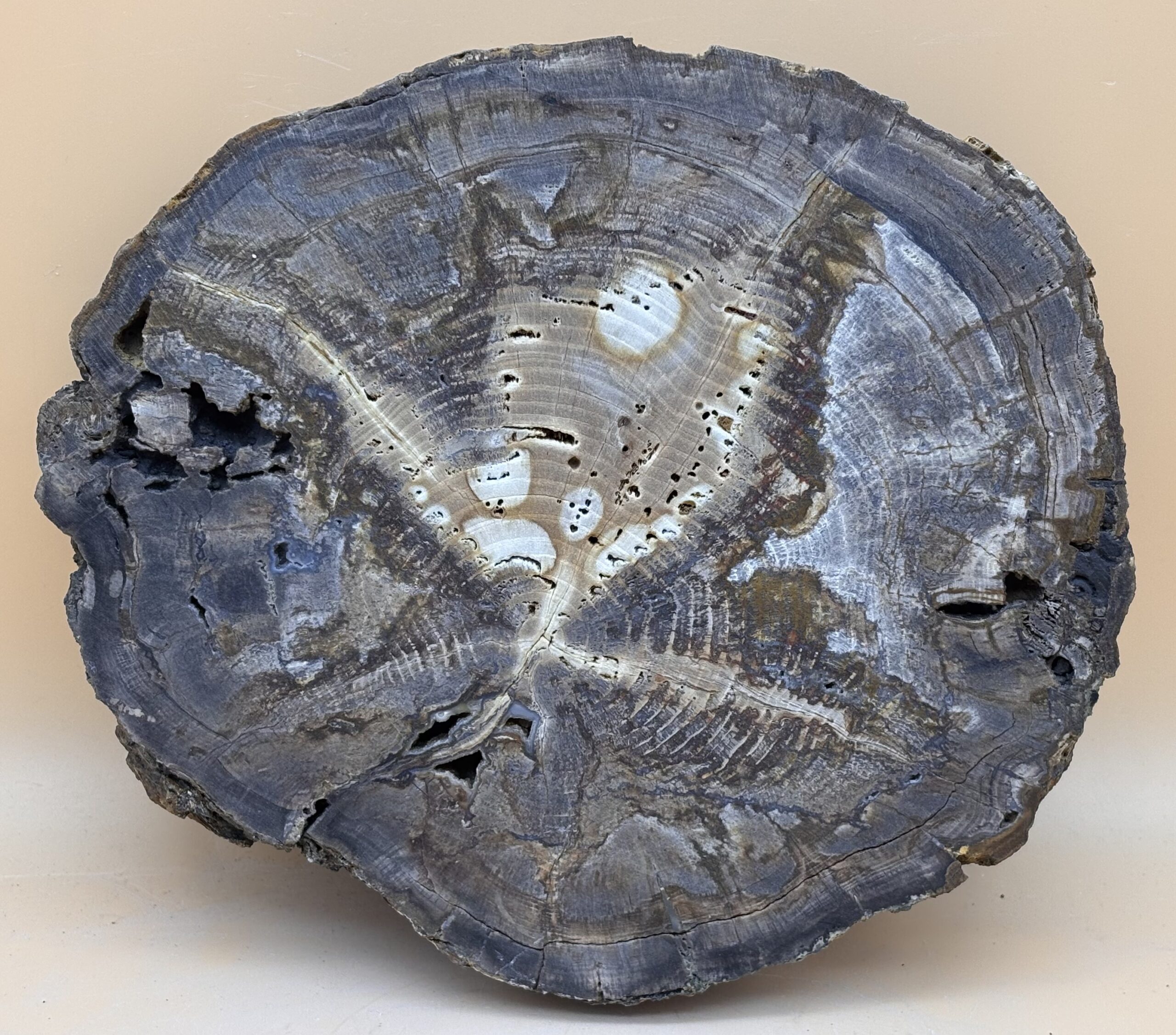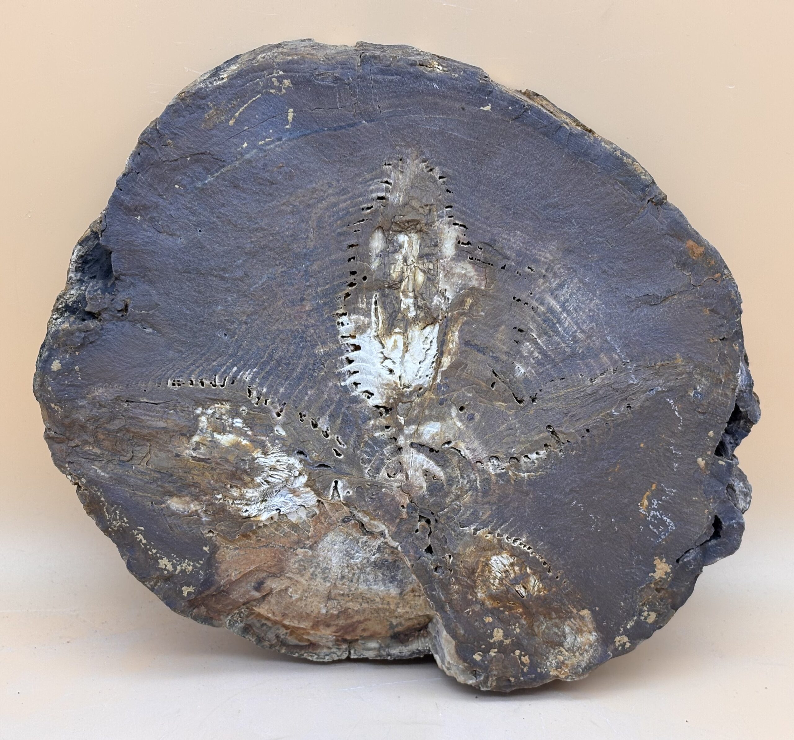 seltenes Fundstück von der Schwarzmeer Küste der Türkei. Araucarien wuchsen bereits vor ca. 250 Mio. Jahren in der Trias und wachsen heute noch in den Anden Südamerikas, sind aber wegen des Klimawandels vom Aussterben bedroht. Auf der Bruchfläche des Stammes sind die Astausgänge sichtbar, was bei den meisten versteinerten Stämmen nicht sichtbar ist. Die Wachstumsringe des Baumes sind gut sichtbar.